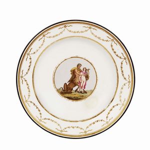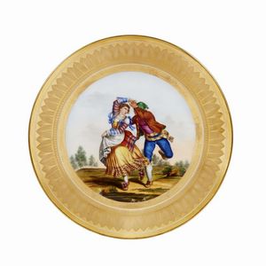 PIATTO, NAPOLI, MANIFATTURA GIOVINE, 1830 CIRCA in porcellana dipinta in policromia e oro, raffigurante nel cavetto [..]