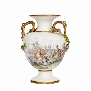 VASETTO, NAPOLI, MANIFATTURA DI CAPODIMONTE, 1750 CIRCA in porcellana dipinta in policromia e oro, corpo ovoidale [..]