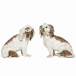 COPPIA DI FIGURE, GERMANIA, MANIFATTURA DI MEISSEN, SECOLO XIX in porcellana policroma raffiguranti due cani, [..]
