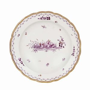 PIATTO, NAPOLI, REAL FABBRICA FERDINANDEA, 1790 CIRCA in porcellana dipinta in policromia e oro, al centro del [..]