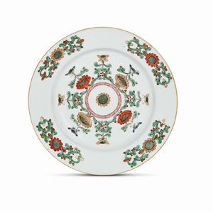 PIATTO, CINA PER LA COMPAGNIA DELLE INDIE OLANDESI, 1735 CIRCA in porcellana dipinta con palette di colori fencai, [..]