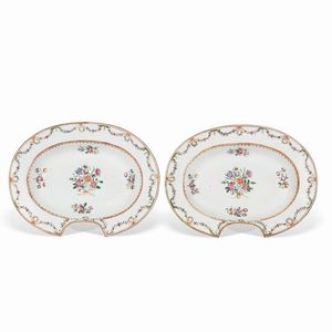 COPPIA DI VASSOI DA BARBA, CINA, DINASTIA QING, PERIODO QIANLONG, 1760 CIRCA in porcellana policroma, corpo di [..]