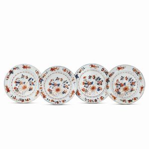QUATTRO PIATTI, CINA, SECONDA METÀ SECOLO XVIII in porcellana dipinta in policromia secondo i tipici decori [..]