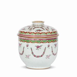VASO CON COPERCHIO, CINA, DINASTIA QING - PERIODO YONGZHENG, 1730 CIRCA in porcellana dipinta in policromia con [..]