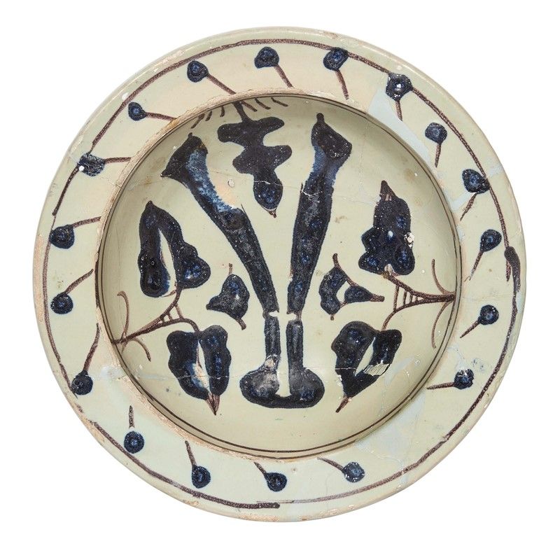 In maiolica decorata a zaffera, forma concava tesa piana, poggiante su basso piede a cercine. Smalto azzurrato, motivo gotico con foglie di quercia a contornare una iniziale V. Sulla tesa decoro a fior di cappero. La forma e il decoro in assenza di una provenianza certa ci suggeriscono una posibile produzione in ambito faentino agli inizi del secolo XV quando nella città romagnola e nelle fornaci dei dintorni si producevano queste raffinate ceramiche con predilezione per le forme chiuse. Le ciotole e le forme aperte in particolare quelle a calotta con tesa sono invece piuttosto rare; diam. cm 17, diam. piede cm 5,4, alt. cm 5