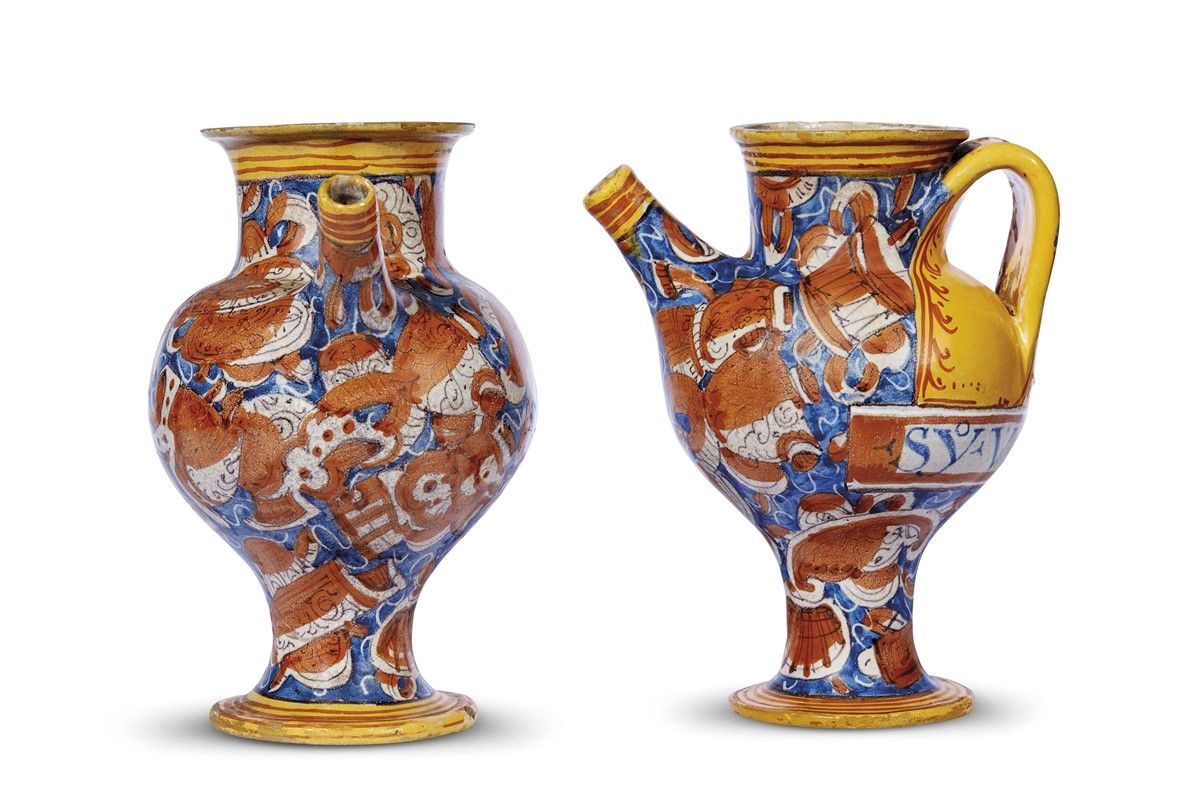 in maiolica dipinta in policromia con giallo arancio, blu cobalto, giallo antimonio, bianco stagno e bruno di manganese, corpo piriforme fortemente rastremato verso il basso su piede a disco a base piana e collo cilindrico su imboccatura con orlo estroflesso; sul fronte si apre un beccuccio a cannello e sul retro è collocata un’ansa a nastro larga e rilevata ai bordi. L’intera superficie dei vasi è interessata da un decoro a trofei con strumenti musicali e conchiglie. Sopra l’ansa è dipinto un angelo che tiene in mano la croce e un globo, simbolo del mondo, ai cui piedi corre il cartiglio farmaceutico, redatto in blu con scritte in caratteri capitali e ombreggiato in arancio. Nella parte inferiore, tra il cartiglio e il piede, un emblema cuoriforme con le lettere C.R.D. tracciate in azzurro. In uno dei due orcioli sotto l’emblema della farmacia in un cartiglio si legge la data 1618. I vasi appartengono ad un’importante Farmacia che annovera molti esemplari custoditi in Musei e collezioni private, tra i quali si ricordano l’orciolo della collezione Cora e due nella collezione Strozzi Sacrati; alt. cm 24,6, diam. bocca cm 9,8 e 11,2, diam. piede cm 10,2 e 10,8