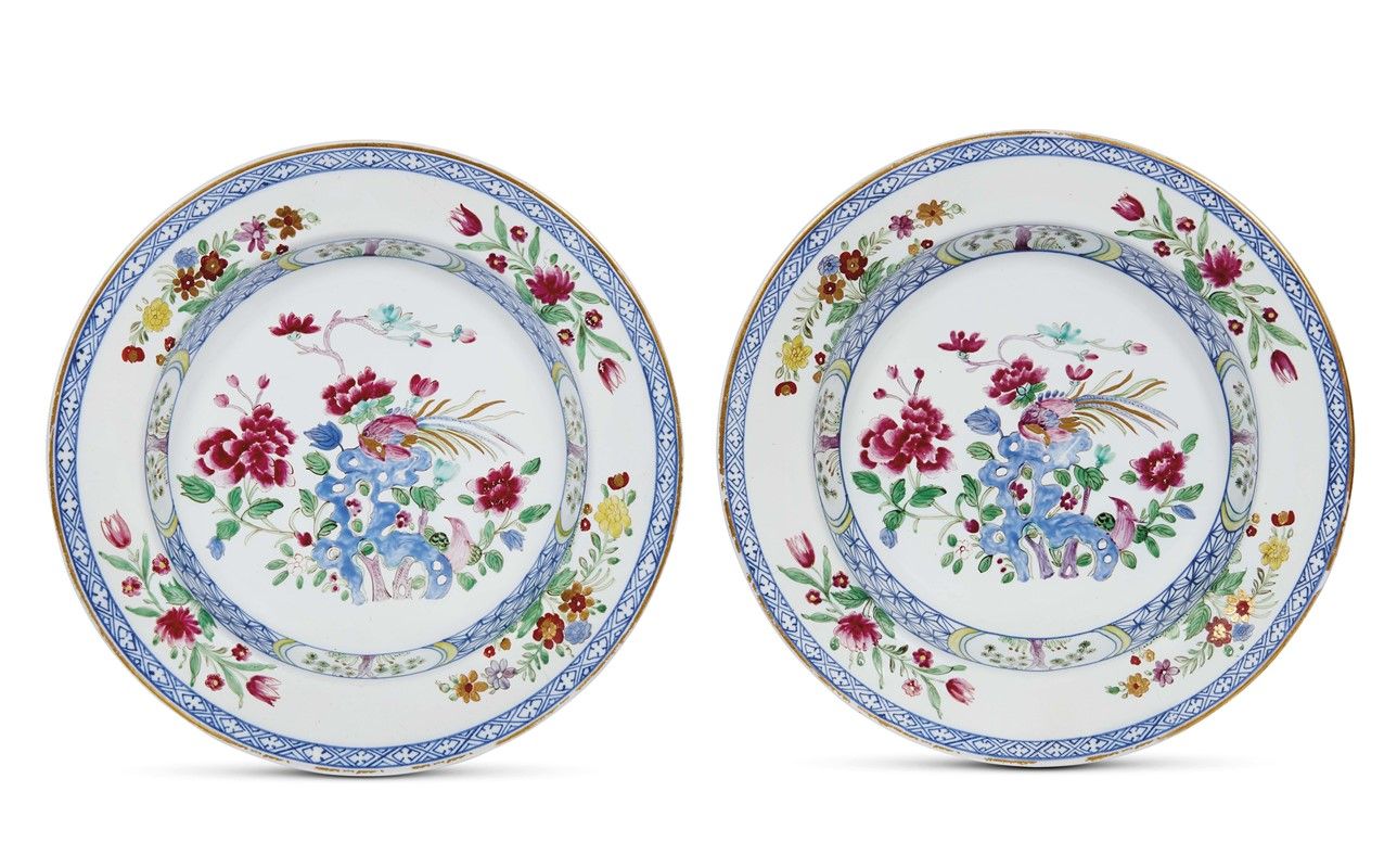 in porcellana policroma dipinta in policromia, secondo un decoro di ispirazione orientale, che vede nel cavetto una ricca decorazione floreale con rocce stilizzate sulle quali è posato un uccello del paradiso, sulla fascia di stacco una larga striscia continua a motivi geometrici intervallata da quattro riserve ovali contenenti pini cinesi, mentre sulla tesa quattro mazzetti di fiori europei. E proprio nella compresenza di decori cinesi tipici della “famiglia rosa” e decori a fiori europei sta la particolarità di questa coppia di piatti, riferibili al secondo periodo della Manifattura; diam. cm 23