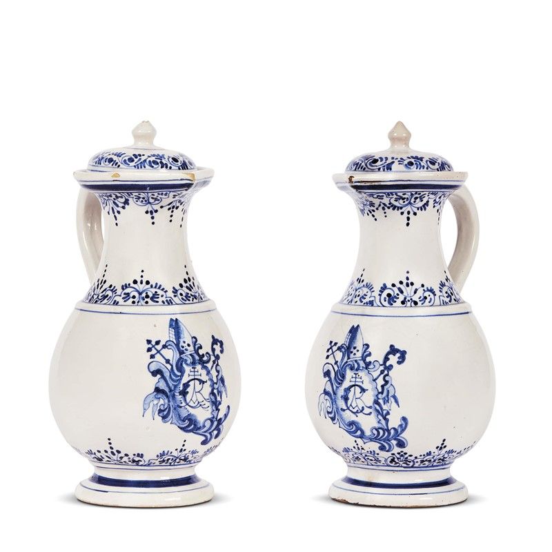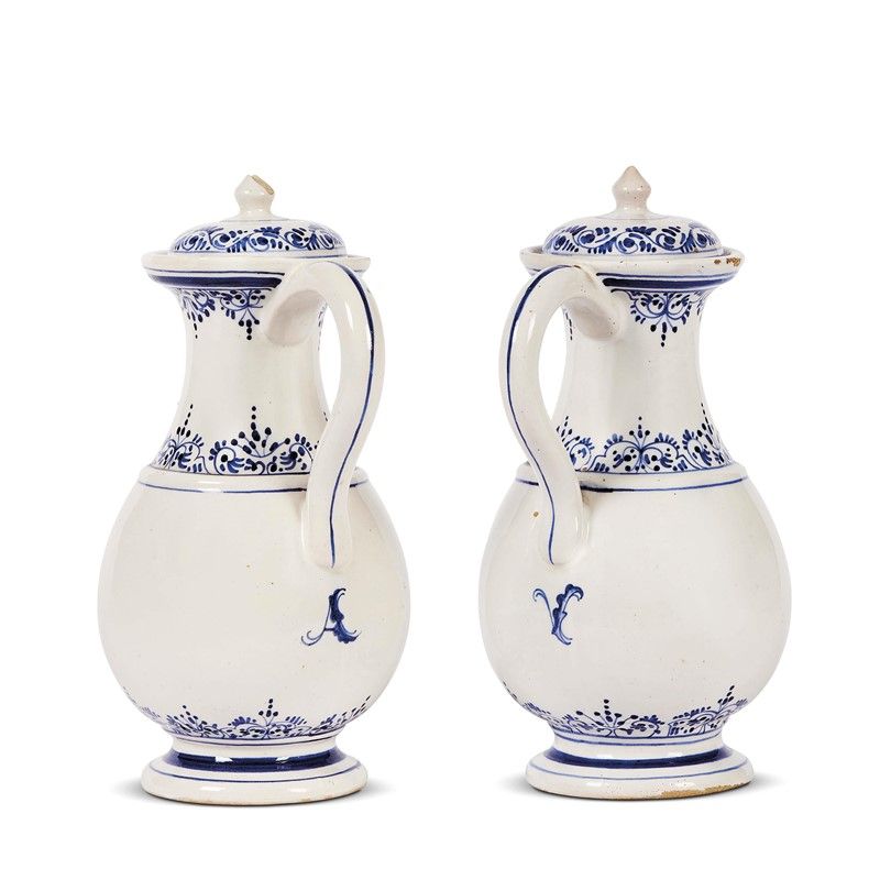 in maiolica dipinta in monocromia blu, caratterizzati sul fronte dalla presenza del monogramma CAR, abbreviazione di Cartusia, in uno scudo ornato da motivi fitomorfi e sormontato dagli attributi di abate. Le due brocche con coperchio erano destinate una per l’acqua e l’altra per il vino, come testimoniato dalle lettere A e V poste al di sotto del manico, e facevano parte di un importante “servito da pranzo” composto originariamente da 395 pezzi e realizzato nel 1765 dalla fabbrica del marchese Ginori su espressa richiesta del Priore Maggi, all’epoca abate dell’importante Certosa di Calci; alt. cm 24, diam. piede cm 8,4
