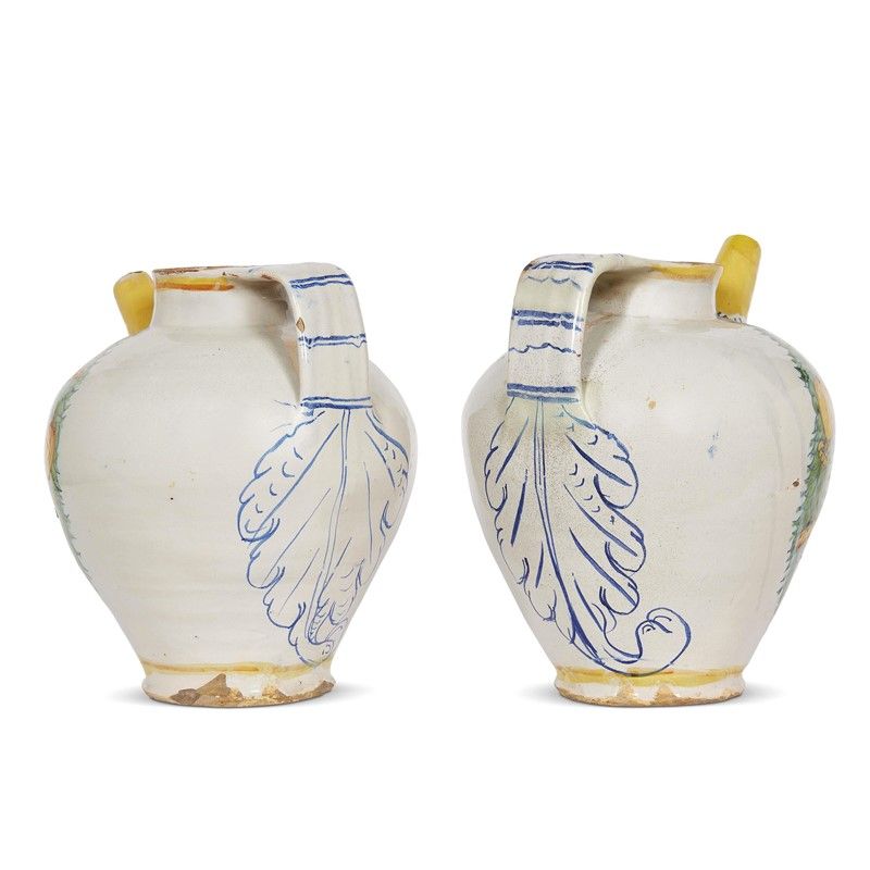 in maiolica dipinta in policromia, corpo fortemente globulare con collo stretto, cannello breve portato rilevato e ansa a nastro piuttosto larga; il decoro, che si sviluppa principalmente sul fronte, prevede un medaglione con cornice a ghirlanda sormontato dall’emblema dello Spirito Santo, ad incorniciare un’ampio cartiglio con voluta marcata ai lati, iscritto rispettivamente AQA.DE.BURAGINE e AQA.VIOLATA. Due vasi analoghi, già nella collezione Serra con attribuzione a Faenza, hanno recentemente trovato una proposta attributiva a manifatture eugubine del XVII secolo. Altri esemplari, accompagnati anche da albarelli dello stesso corredo, sono conservati nel museo di Gubbio, mentre una coppia è presente al MIC di Faenza con attribuzione a Casteldurante; alt. cm 30 e 31, diam. bocca cm 9,8 10,4, diam. piede cm 13,5 e 13,2