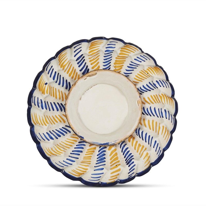 in maiolica dipinta in policroma, di forma sagomata e baccellata poggiante su alto piede. Il decoro vede al centro del cavetto un putto gradiente con un ramoscello di ulivo in mano, mentre intorno si sviluppa un decoro “a quartieri “con pannelli scanalati radianti di acanto riservati su fondo blu, ocra e verde, e con bordura che alternata una foglia di prezzemolo a una palmetta stilizzata, sempre inserire in quartieri definiti; diam, cm 26, diam. piede cm 12,8, alt. cm 6,8