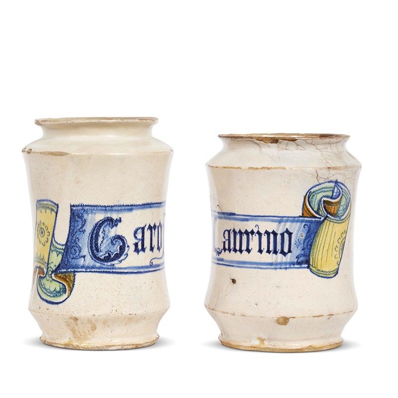 in maiolica dipinta in policromia, corpo di forma cilindrica appena rastremata al centro con spalla e base angolate, breve collo con orlo estroflesso e base piana. Entrambe recano un cartiglio con scritta farmaceutica che corre al centro del corpo. Probabilmente uno dei vasi è stato realizzato nel secolo scorso al fine di reintegro di farmacia; alt. cm 22,8 e cm 21, diam. bocca cm 12,4 e cm 13,2, diam. piede cm 12 e cm 12,2