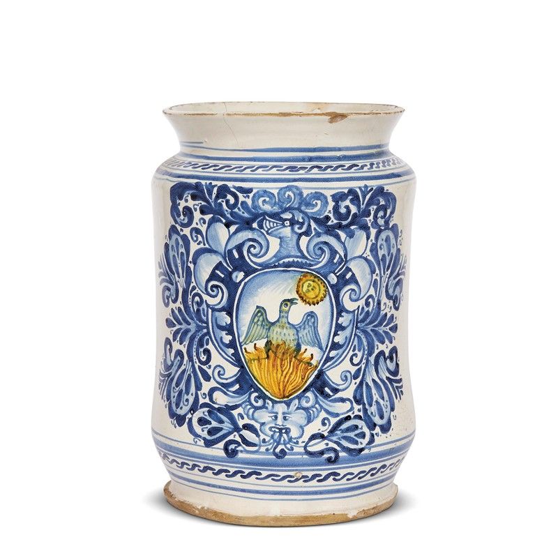 in maiolica dipinta in policromia, corpo cilindrico leggermente rastremato al centro, spalla arrotondata da cui si alza un alto collo cilindrico e svasato con orlo tagliato a stecca, piede basso e appena svasato su base piana, priva di smalto. Il decoro, realizzato con tecnica” a gran fuoco”, in monocromia blu su fondo a smalto stannifero bianco vede sul fronte un emblema farmaceutico incorniciato da cartouches, sormontato da cimiero e sorretto da un mascherone, con stemma a mandorla centrato da una colomba su fuoco ardente e sole pieno sullo sfondo. Intorno larghe fasce a decori floreali; alt. cm 26,8, diam. bocca cm 16,2, diam. piede cm 16