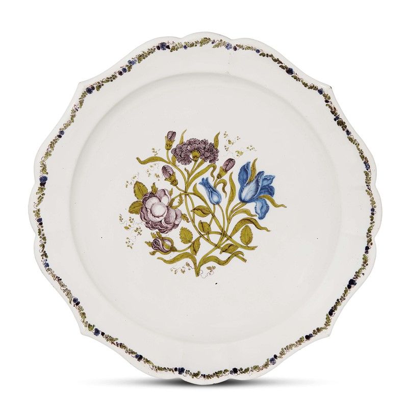 in maiolica dipinta in policromia, orlo polilobato e tesa appena costolata. Porta un decoro tipico della produzione di Pasquale Antonibon negli anni iniziali della manifattura, con un bouquet di fiori naturalistici con rosa, garofano e tulipano; diam. cm 45,5, alt. cm 5,6