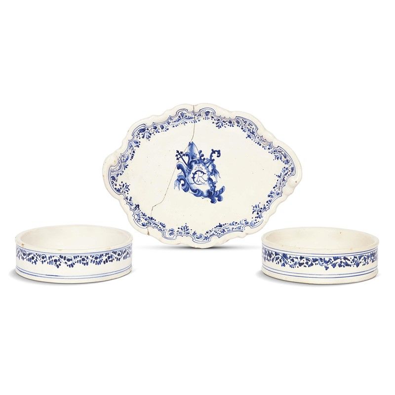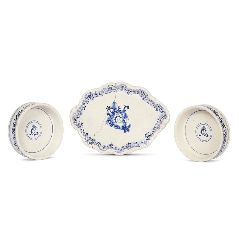 in maiolica dipinta in monocromia blu, caratterizzati sul fronte dalla presenza del monogramma CAR, abbreviazione di Cartusia, in uno scudo ornato da motivi fitomorfi e sormontato dagli attributi di abate. I pezzi facevano parte di un importante “servito da pranzo” composto originariamente da 395 pezzi e realizzato nel 1765 dalla fabbrica del marchese Ginori su espressa richiesta del Priore Maggi, all’epoca abate dell’importante Certosa di Calci; marescialla cm 18,2x25, sottobottiglie diam cm 13,5, alt. cm 4