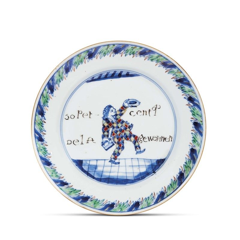 in porcellana dipinta in policromia, ha largo cavetto piano e tesa obliqua con orlo arrotondato. Al centro della composizione è raffigurato Arlecchino con il cappello in una mano, in segno di giubilo, mentre nell’altra trattiene un’azione. La legenda recita: “50 per cent op Delft gewonnen” (ossia “50% di profitto su Delft”) con evidente illusione alla capitalizzazione azionaria della Delfshaven, che incitava gli azionisti ad investire su una società di assicurazione marittima. Il piatto risulta dipinto in due tempi, la parte policroma prima e quindi l’aggiunta delle lumeggiature di oro che esaltano la figura, il contesto architettonico del pavimento e la bella corona di foglie a ciuffi che circonda l’orlo. La serie di piatti con personaggi della Commedia dell’Arte, tratti dal testo le Gran Tableau de la Folie, ebbe tra il 1721 e il 1735 grandi estimatori tra gli importatori della porcellana della Compagnia delle Indie. La prima serie, cui appartiene questo piatto anche per le dimensioni, fu di campione per le serie successive; diam. cm 21, alt. cm 3