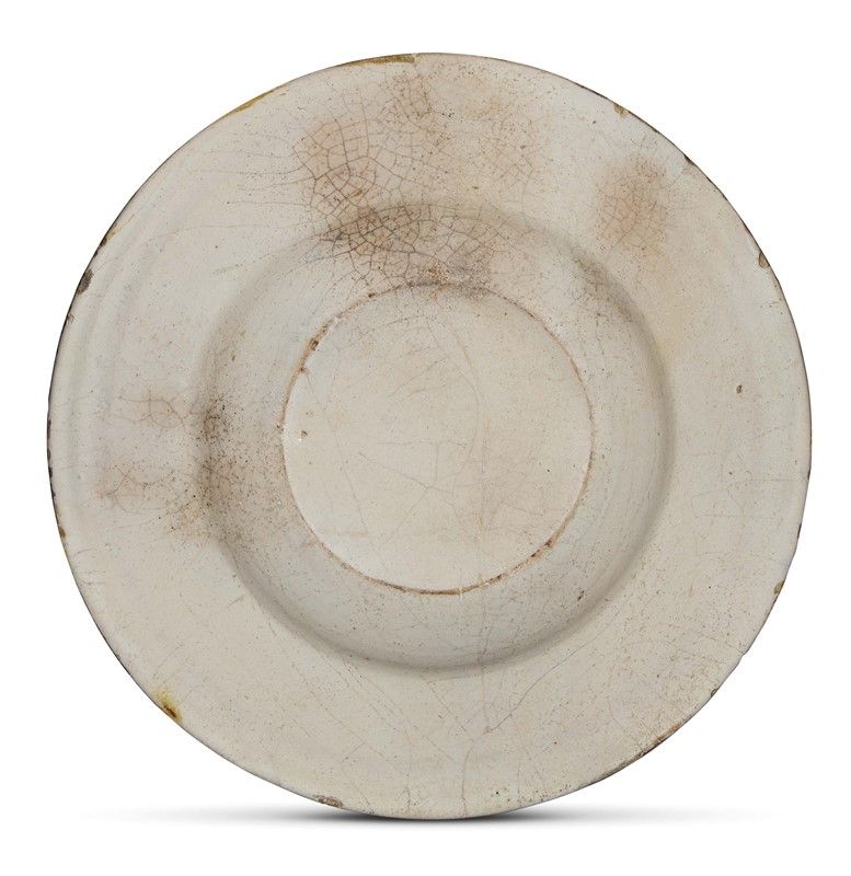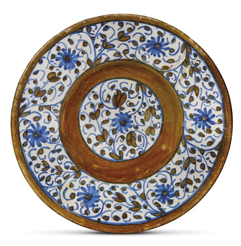 in maiolica dipinta in policromia e lustro. La superficie del fronte mostra un fitto decoro a fiori e tralci, intervallato tra lo stacco della tesa e il cavetto da un’ampia fascia monocroma in lustro, che si ripete in maniera più sottile sull’orlo. Un interessante esemplare di confronto è presente nella Donazione Conti al Museo del Bargello a Firenze; diam. cm 22,4, diam. piede cm 9, alt. cm 3,5