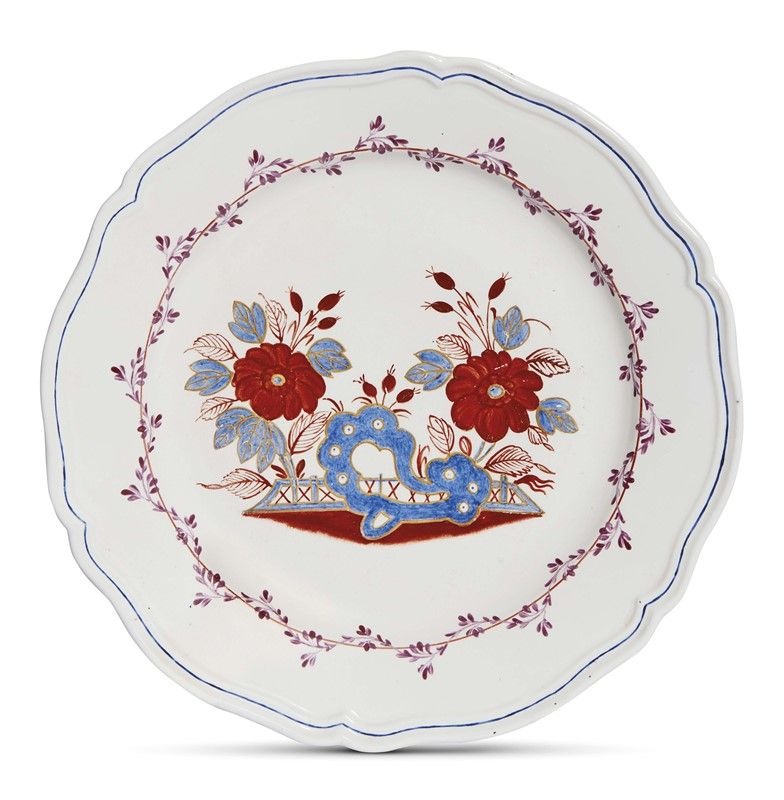 in porcellana dipinta in policromia, cavetto profondo con tesa orizzontale dall’orlo sagomato, poggiante su piede ad anello appena rilevato; mostra una decorazione con peonie, rocce, graticci e fioretti minori, realizzata in blu e rosso secondo i dettami del tipico decoro cinese, qui unito a una sottile ghirlanda porpora di ispirazione occidentale; diam. cm 23,2, alt. cm 3