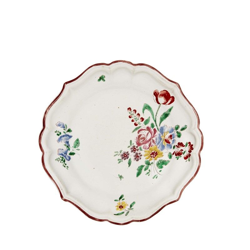 in maiolica dipinta in policromia, orlo sagomato e orlato di rosso. Il decoro floreale mostra nell’uso del colore alcune affinità con gli steli fioriti che compaiono in piatti "a paesini e figure a smalto", confortando nell’attribuzione di questo piatto come prodotto dell'Ospedaletto; diam. cm 20