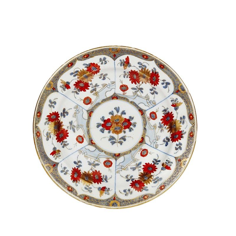 in maiolica dipinta in policromia con decoro Imari. Al centro medaglione circolare e partizioni disposte a raggera sulla balza, mentre la tesa è interessata da un motivo campito in blu e ornato in rosso e oro, mentre i fiori orientali ornano le campiture secondo una modalità a giardino orientale. Un interessante confronto può essere avanzato con un assortimento delle Civiche raccolte di arti Applicate del Castello Sforzesco di Milano; diam. cm 23