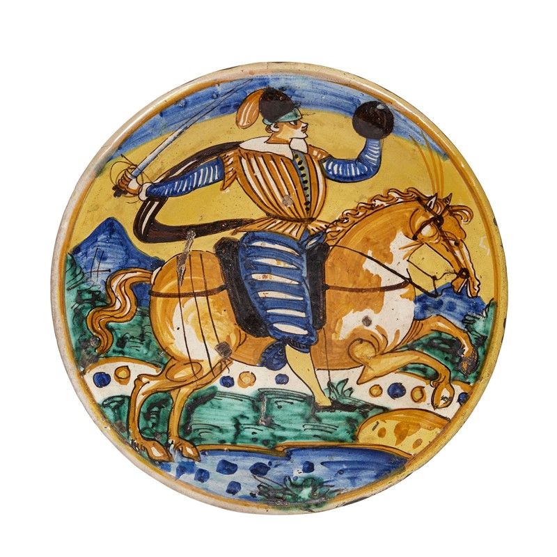 in maiolica dipinta in policromia, forma piana leggermente concava con orlo arrotondato e piede ad anello appena rilevato. La superficie è interamente ricoperta dalla decorazione policroma, mentre sul retro il piatto mostra tre linee concentriche in manganese. Sul fronte a piena superficie è raffigurato un cavaliere con spada e scudo, inserito nel tipico paesaggio con due picchi montuosi ai lati; diam. cm 32, diam. piede cm 15,1, alt. cm 5,6