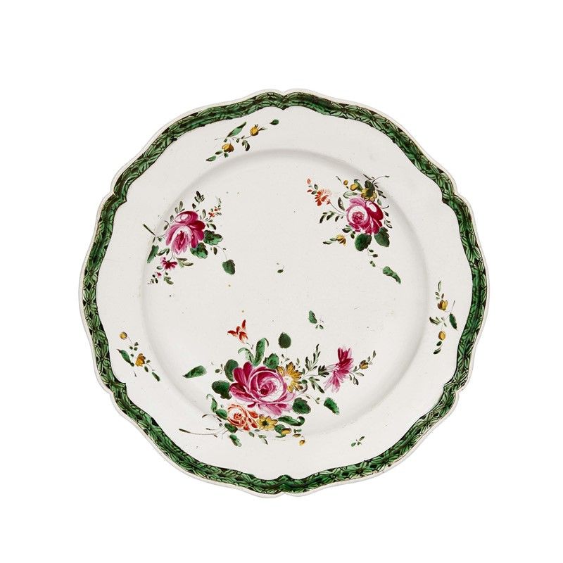 PIATTO, MONTEMILONE, FINE SECOLO XVIII in maiolica dipinta in policromia, bordo dal profilo mosso, tesa lievemente rilevata e fondo piano. Il decoro a terzo fuoco mostra un grande mazzo di fiori con tipica rosa e due mazzetti minori con rametti fioriti e fogliati, mentre il bordo presenta una fascia verde e manganese ornata a graticcio; diam. cm 23,8