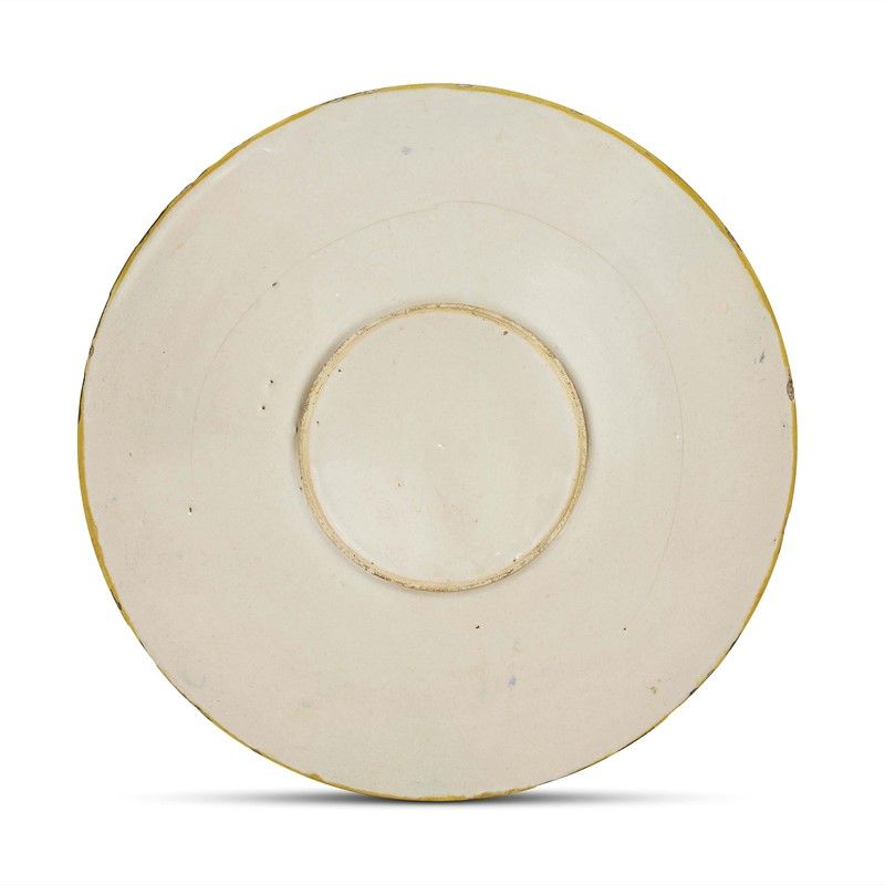 in maiolica dipinta in policromia, raffigurante una figura femminile seduta nei pressi di un albero in un paesaggio lacustre. La qualità pittorica del piattello in esame è alta: il personaggio è dipinto con lo stile sicuro dei pittori istoriatori su uno sfondo impreziosito da elementi pittorici accurati. Alla produzione della bottega veneziana di Mastro Domenico tra il 1560 e il 1575 furono spesso attribuite opere caratterizzate dalla presenza di un personaggio solo che spicca nel paesaggio agreste, lo stesso che spesso si riconosce anche come sfondo nei vasi farmaceutici; diam, cm 24,4, diam. piede cm 9,6, alt. cm 2,6