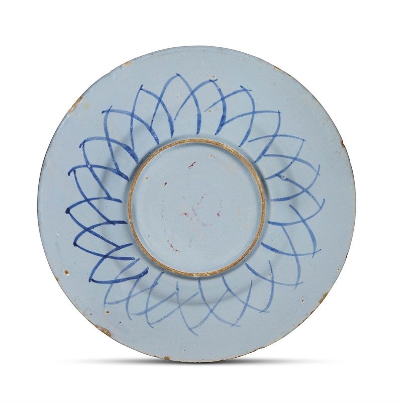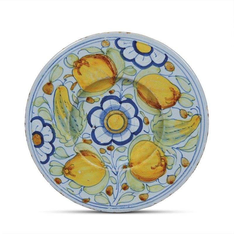in maiolica dipinta in policromia su fondo azzurro “berrettino” con frutta e larghi fiori dalle corolle a più petali. Questa tipologia di opere, talvolta con varianti, è solitamente attribuita dalla critica alle manifatture veneziane della fine del Cinquecento oppure alle manifatture attive nel territorio di Padova nello stesso periodo, talvolta con qualche ritardo nella produzione fino ad arrivare all’inizio del secolo successivo; diam, cm 25,5, diam. piede cm 11, alt. cm 2,5