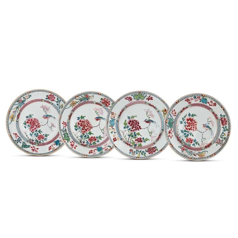 QUATTRO PIATTI, CINA, SECONDA METÀ SECOLO XVIII in porcellana dipinta in policromia secondo i tipici decori della “famiglia rosa”. Il centro del cavetto mostra un cespuglio di peonie, dal quale esce un ramo che funge da appoggio per un uccello variopinto, mentre la tesa è percorsa da composizioni floreali tra due cornici concentriche con motivi geometrici intervallati da semplici fiorellini; diam. cm 22