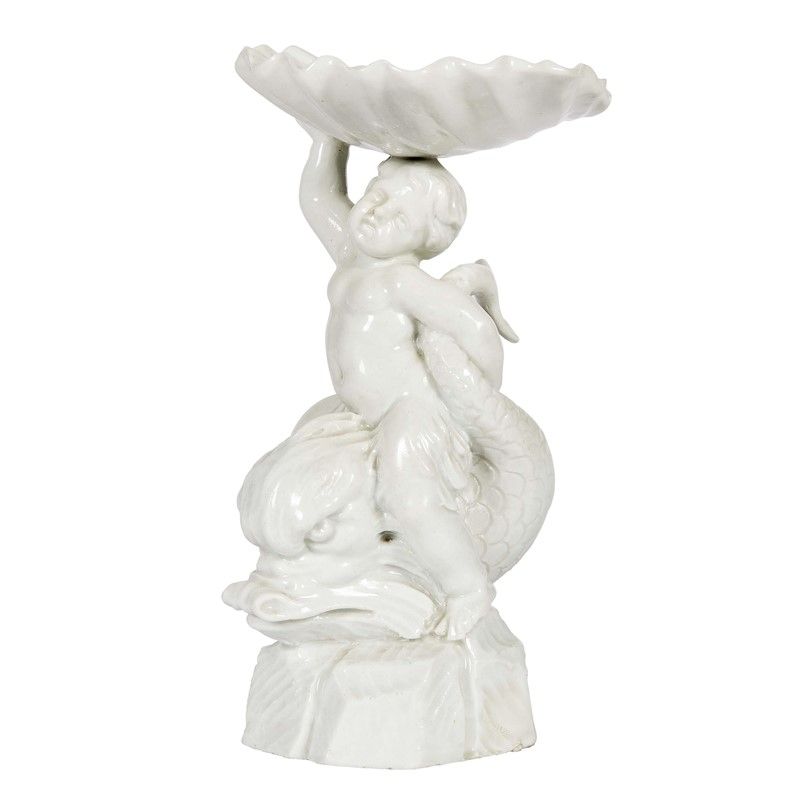 in porcellana acroma raffigurante un putto che, cavalcando un delfino, sorregge sul capo una valva di conchiglia. La plastica della figura, la materia e la raffinata semplicità dell’opera ci riportano ai putti variamente utilizzati in manifattura a sorreggere candelieri oppure in funzione di base di gruppi maggiori; alt. cm 19