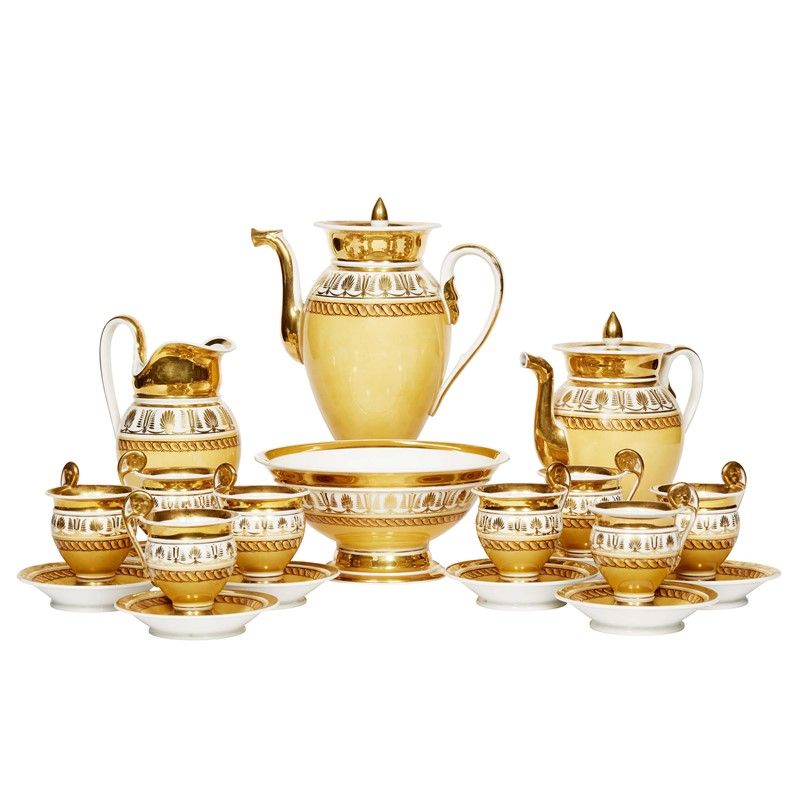 in porcellana dipinta in monocromia e oro, forma delle tazze globulare che riprende la forma dei pezzi di servizio. Il decoro prevede fasce parallele con ornati in oro a palmette di gusto classico e una larga fascia color crema. Composto da teiera, caffettiera, lattiera, biscottiera, otto tazzine con piattino