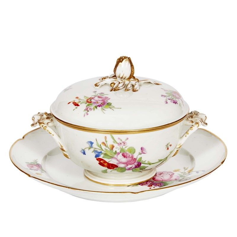 in porcellana dipinta in policromia e oro, corpo emisferico con anse applicate a forma di rametti incrociati, coperchio a cupola sormontato da una presa a forma di bocciolo; piatto liscio di forma circolare. Il decoro è incentrato su un insieme di composizioni floreali con protagonista una rosellina, genere di ornato che appartiene al primo periodo di produzione della manifattura (1755-1770) sotto la proprietà del barone di Beyerlé e la direzione artistica della moglie. Sul fondo marca della manifattura ed etichetta Antichità Questa Torino; diam. cm 21, tazza diam. cm 12,5