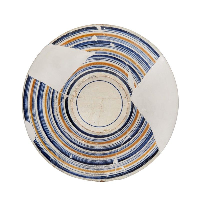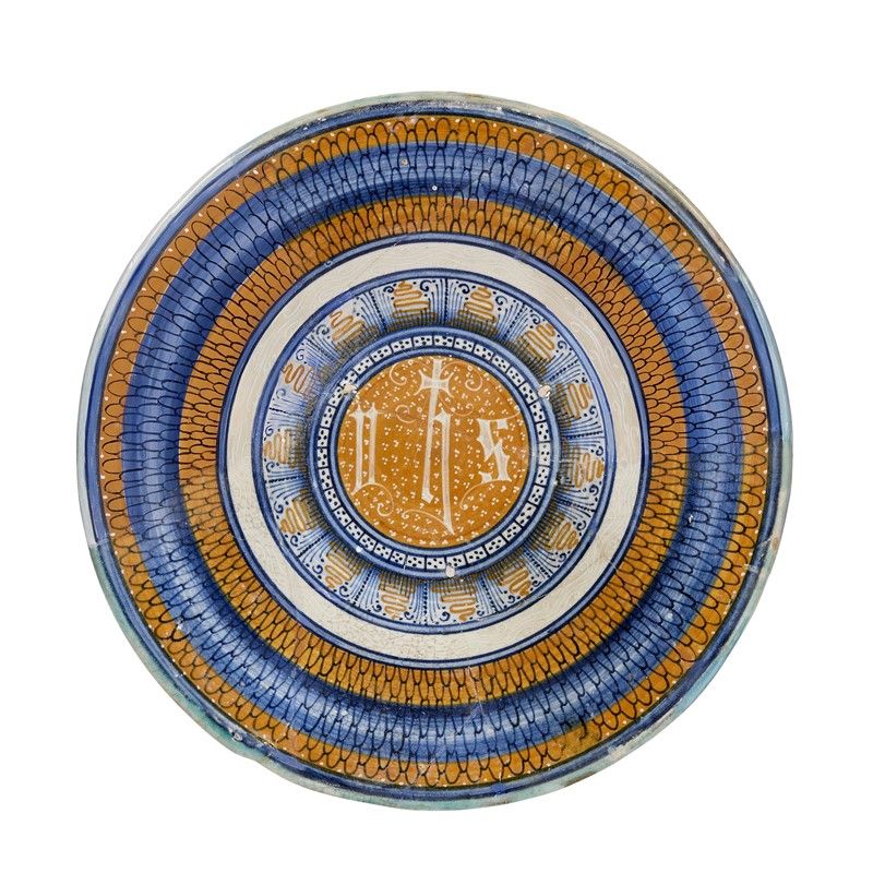 in maiolica dipinta in policromia, decorata al centro del cavetto con l’emblema di San Bernardino, mentre sulla balza si sviluppa un motivo a raggio e il decoro “bianco su bianco” ancora gotico e sulla tesa motivo ad archetti. Al verso motivo a calza larga listata di blu. Il piatto appartiene alla copiosa produzione conventuale che caratterizza il periodo produttivo di fine quattrocento a Faenza, qui in una accezione particolarmente evoluta che unisce motivi ancora tradizionalmente gotici, come la fiamma, ad un decoro decisamente più vicino al gusto tardo quattrocentesco; diam. cm 25, diam. piede cm 8,8, alt. cm 3,6