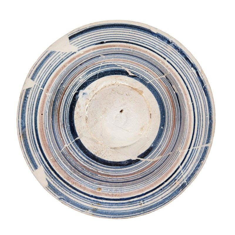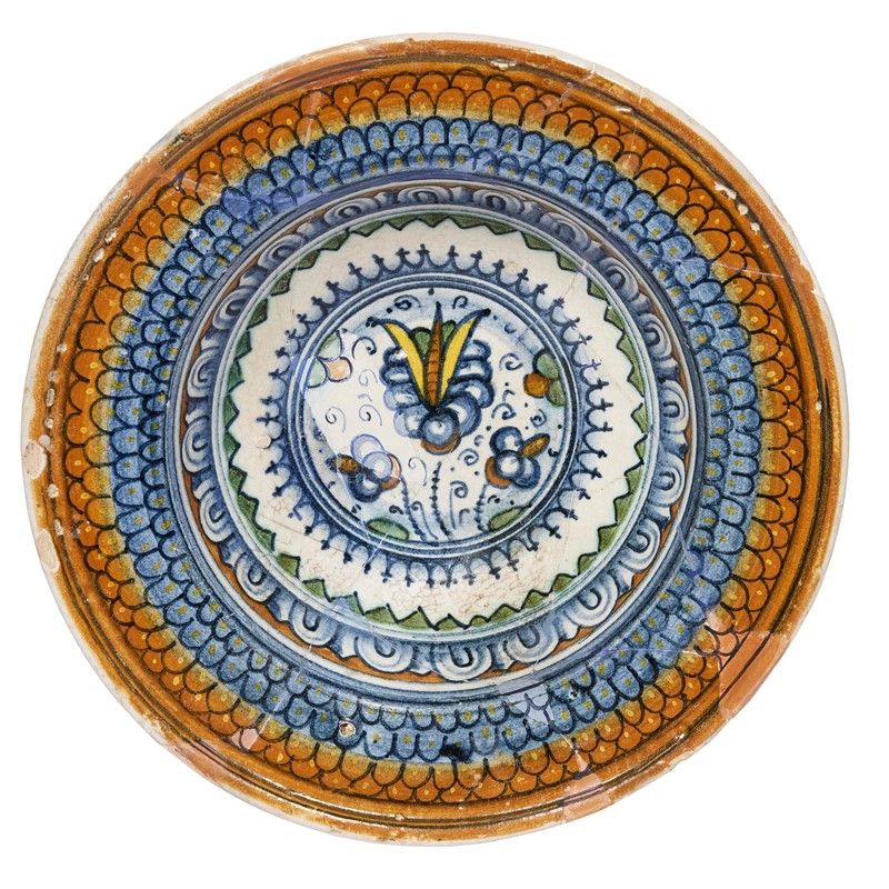 in maiolica dipinta in policromia, al centro del cavetto motivo alla “palmetta persiana”, sulla balza e sulla tesa motivo ad archetti e al retro motivo “a calza”. Il motivo a palmetta è qui protagonista, posto al centro in una versione “a fiore” accompagnata da una fitta decorazione complementare che ne esalta l’importanza. Per modalità stilistiche e materiche l’opera si può inserire nella produzione faentina del secolo XV e trova numerosi confronti nei materiali provenienti dagli sterri della città romagnola; diam. cm 18,2, alt. cm 4,6