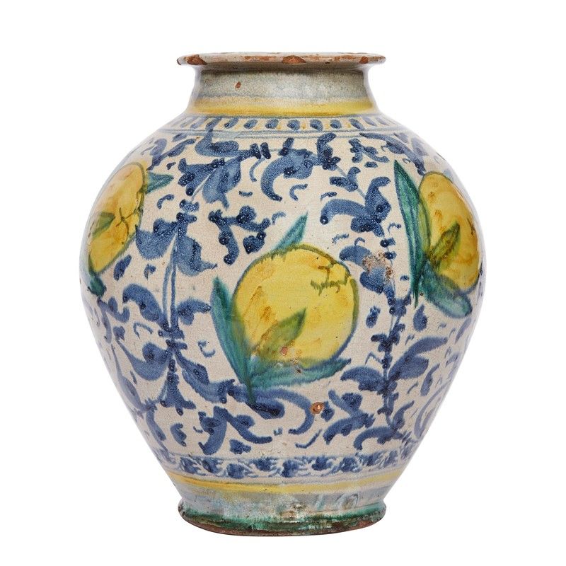 in maiolica dipinta in policromia, raffigurante sul fronte un ritratto femminile di profilo con capo piumato, inserito in una cornice a scudo sagomato; il resto della superficie è interante decorato con cinque grossi limoni contornati da tralci fogliati tracciati in azzurro; alt. cm 27,5, diam. bocca cm 12,6, diam. base cm 12,5