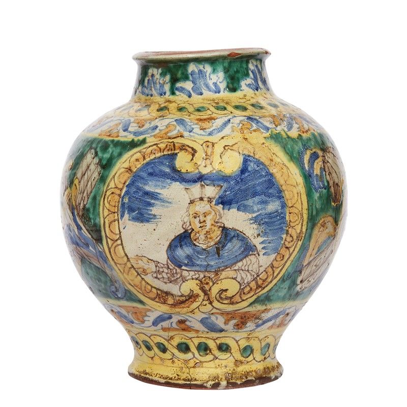 in maiolica dipinta in policromia, raffigurante sul fronte un ritratto maschile coronato entro ricca cornice sagomata, mentre la restante superficie mostra una decorazione a grandi trofei posta su una larga fascia a fondo verde brillante; completano il decoro le tipiche cornici a nastro poste in prossimità del piede e del collo; alt. cm 28,5, diam. bocca cm 12, diam. base cm 13,4