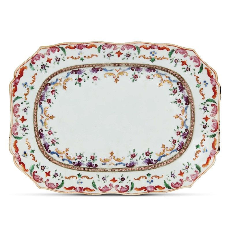 Il vassoio di porcellana dura, spessa bianca e sonora, ha forma oblunga con base piana non smaltata, bordo sagomato e lobato e centro ovaleggiante. La tesa è interessata da una decorazione continua con elementi curvilinei e lobati realizzati in smalti sovra vetrina nei toni del giallo arancio e del rosa di Cassio con elementi floreali in verde e blu sottovetrina. Il cavetto mostra un decoro continuo analogo, ma in dimensioni minori, con uso del viola melanzana e del blu. Alcuni elementi del decoro sono impreziositi in oro. Il vassoio per progetto decorativo e tipologia tecnica ben si inserisce nella produzione per l’occidente, forse destinato al mercato inglese dell’ultimo quarto del XVIII secolo.