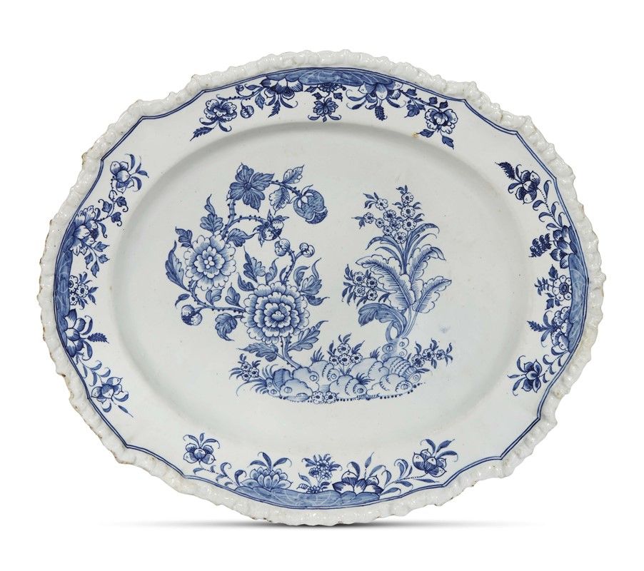 in porcellana, di forma ovale sagomata con orlo mistilineo centinato e modanato. Il decoro, in monocromo blu, mostra un motivo a fiori orientali “alla chinese”: al centro del cavetto una zolla dalla quale s’innalzano due cespugli fioriti, a larghe corolle il primo e con foglie ampie e allungate l’altro; il motivo a fiori si ripete in modo simmetrico sulla tesa. Tale decoro non compare negli inventari della manifattura dopo il 1757, in seguito utilizzato con varianti che comprendono l’aggiunta di paesaggi; cm 31x36,7, alt. massima cm 5