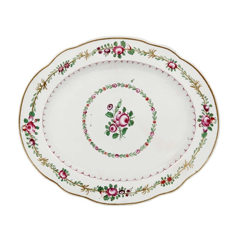 in porcellana dipinta in policromia e oro, di forma ovale con bordo sagomato. La decorazione mostra al centro un mazzo di rose contornato da una ghirlanda floreale di forma circolare, mentre la tesa è interamente dipinta con un serto vegetale intervallato da rose e fiori di dimensioni minori disposti simmetricamente; cm 31x36,5