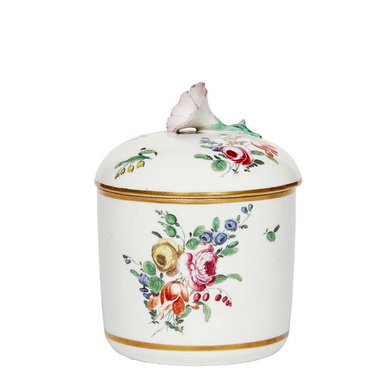 ZUCCHERIERA, DOCCIA, MANIFATTURA GINORI, FINE SECOLO XVIII in porcellana dipinta in policromia e oro, corpo cilindrico con coperchio bombato sormontato da una campanula in funzione di presa. Il decoro prevede i mazzetti di fiori tipici della manifattura fiorentina; alt. cm 10, diam. cm 7