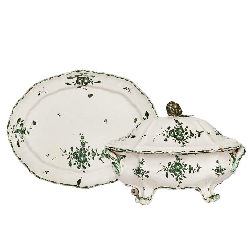 in maiolica dipinta a monocromia verde: La zuppiera ha corpo ovale costolato poggiante su quattro piedini, anse applicate sagomate a staffa, coperchio anch’esso mosso e sagomato, caratterizzato da un’importante presa a carciofo. Il decoro è realizzato a motivi floreali secondo il modello “a mazzolino verde” documentata nella manifattura Ferniani;
