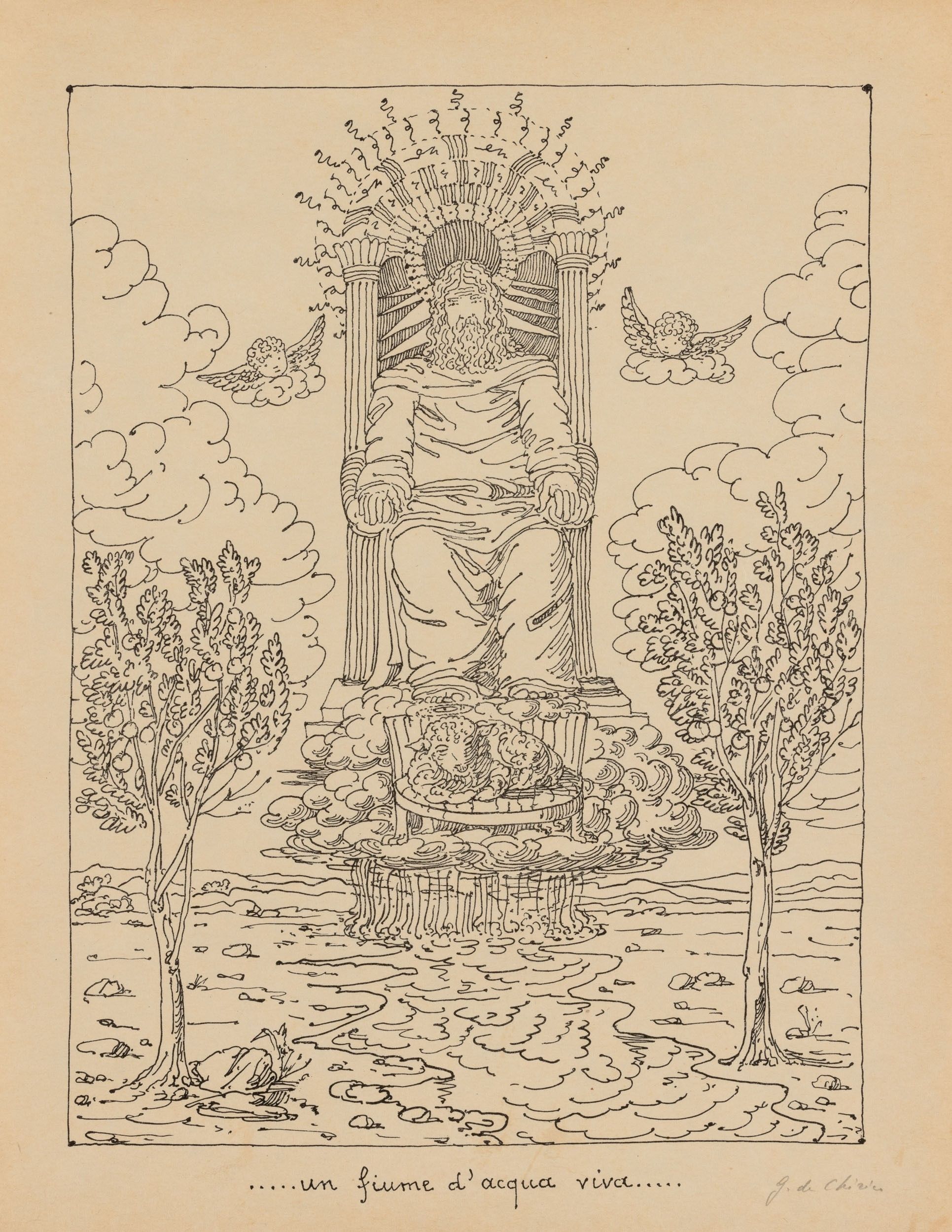 venti litografie tirate a mano nello studio di Piero Fornasetti, Largh. 27,4 - Alt. 35 Cm 1941 ciascuna litografia è firmata in basso a destra Edizioni Della Chimera, Milano 1. Io sono l'Alfa e l'Omega 2. Qualcuno, simile ad un figliolo d'uomo 3. Ed ecco un trono stava nel cielo 4. E gli fu data una corona 5. Il suo nome e' Morte e L'Orco lo accompagnava 6. E gli fu data una grande spada 7. Aveva una bilancia nella sua mano 8. E le stelle caddero sulla Terra 9. Sette Angeli provvisti di sette pieghe 10. E mi disse: prendi a divoralo! 11. E ci fu una grand guerra nel cielo 12. Una donna ravvolta nel sole 13. Ed ecco un gran drago 14. E vidi una bestia salire dal mare 15. Gridando a gran voce a colui che e' seduto sulla nuvola 16. Dopo questo, vidi una grande folla 17. Ed ecco un cavallo bianco 18. La nuova Gerusalemme discende dal cielo 19. Un fiume d'acqua viva 20. Caddi per adorare ai piedi dell'angelo