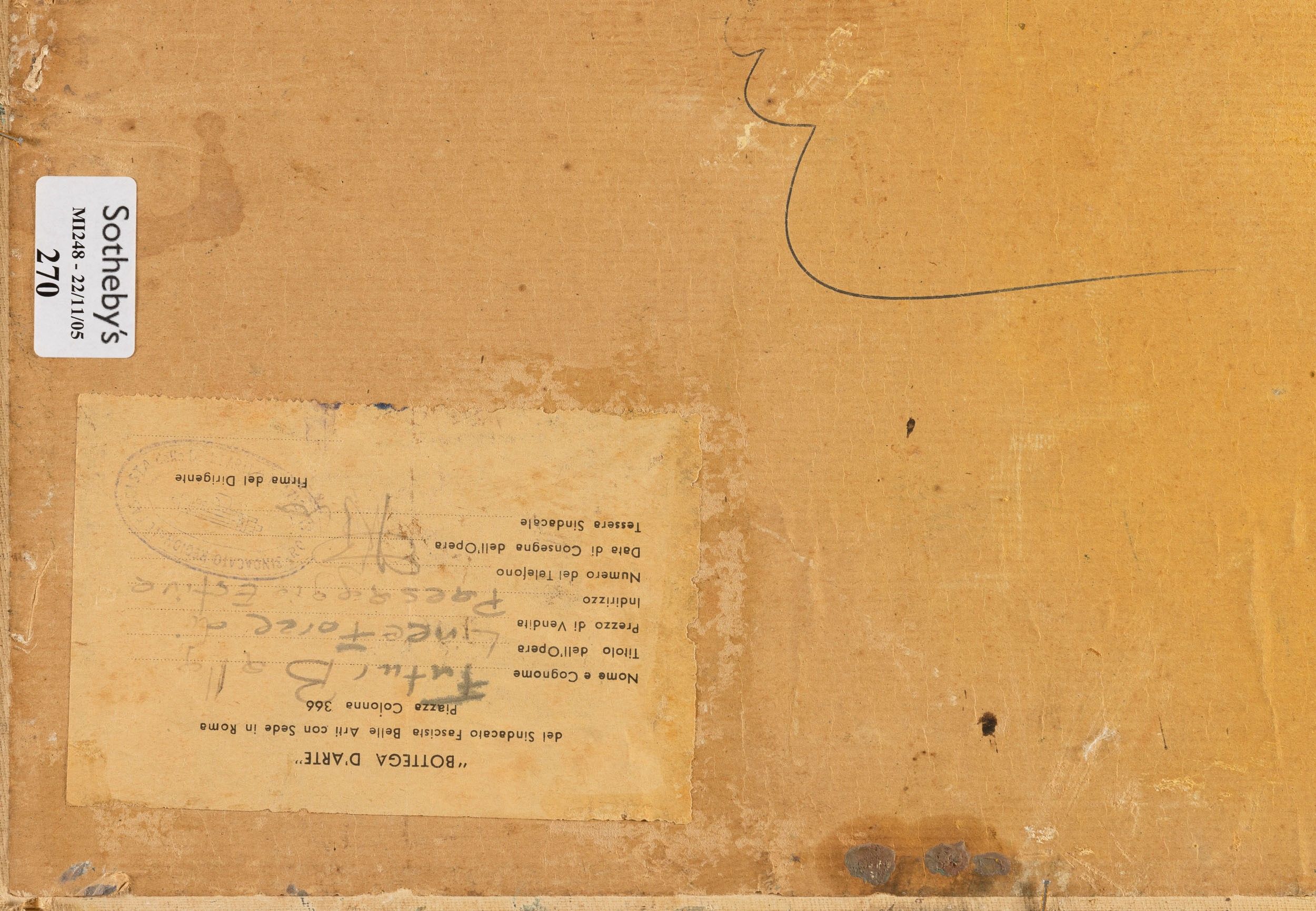 Etichetta al retro della Bottega d'Arte del Sindacato Fascista Belle Arti con sede in Roma, Piazza Colonna 366