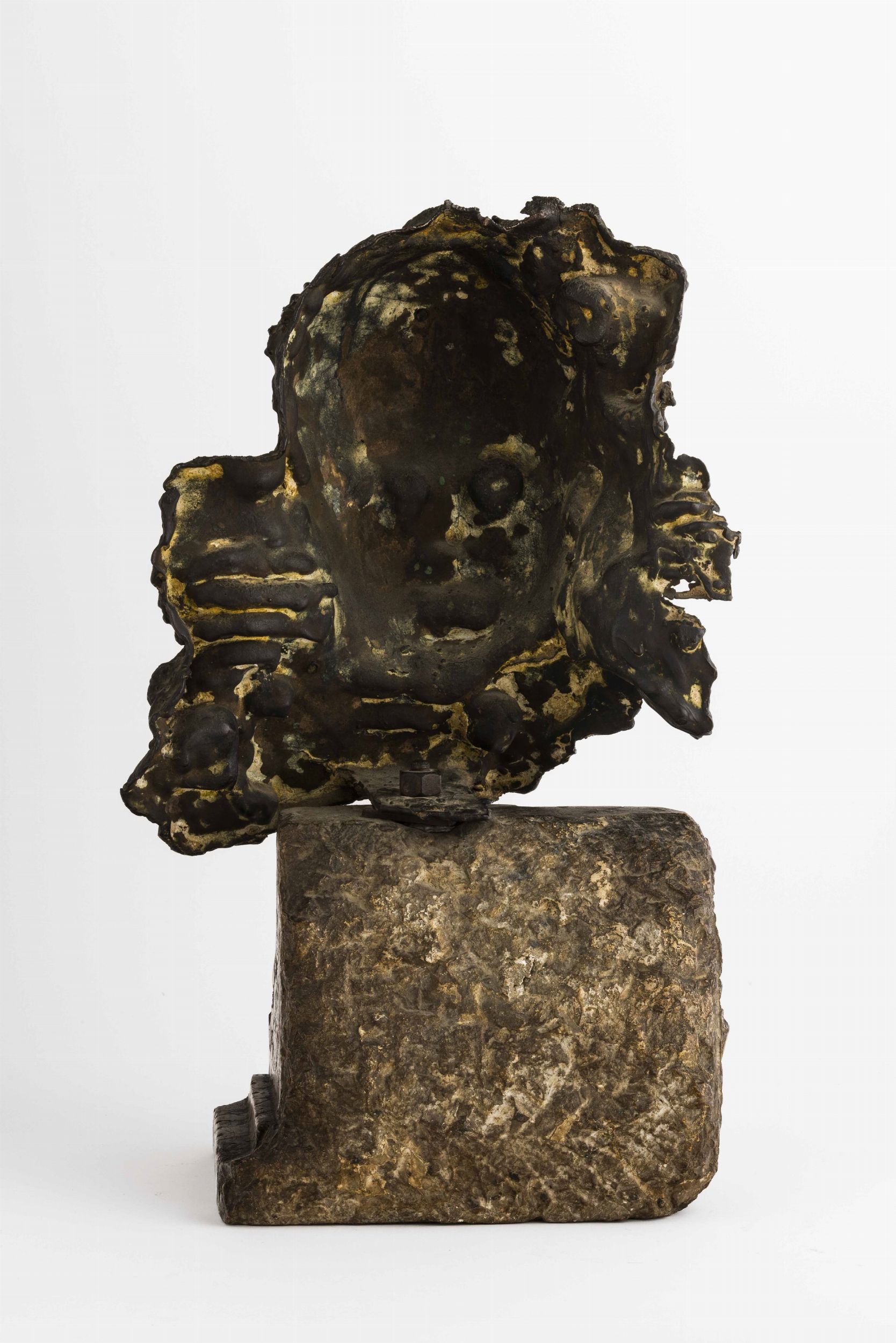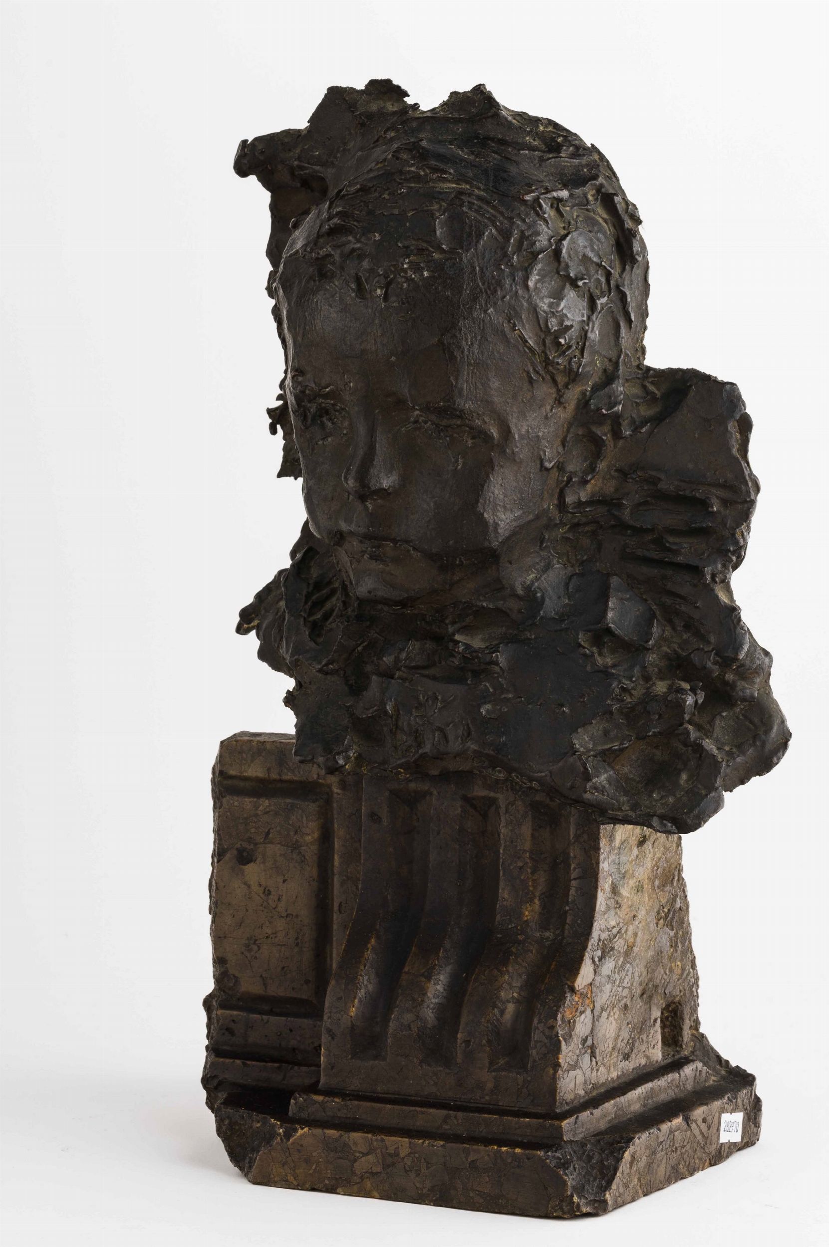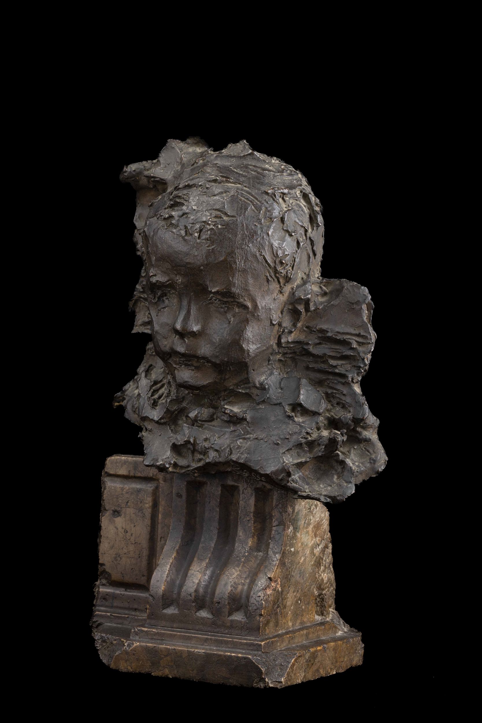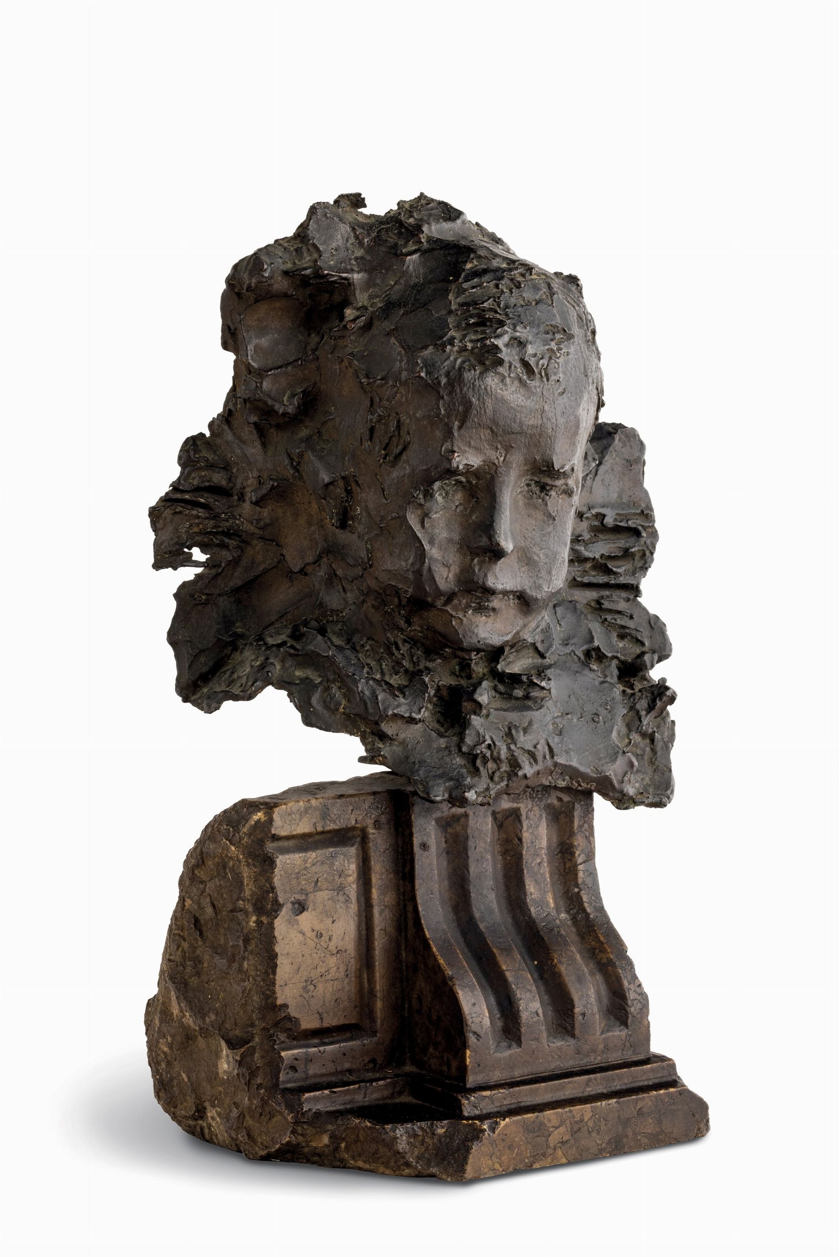 scultura in bronzo montata su frammento architettonico in marmo, Alt. 46 Cm