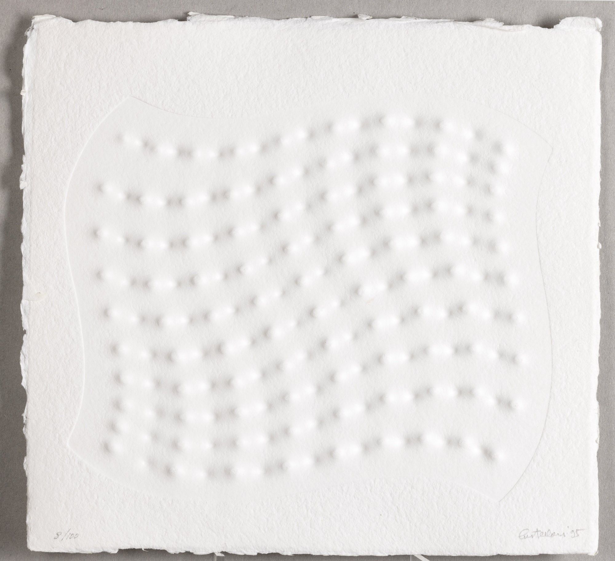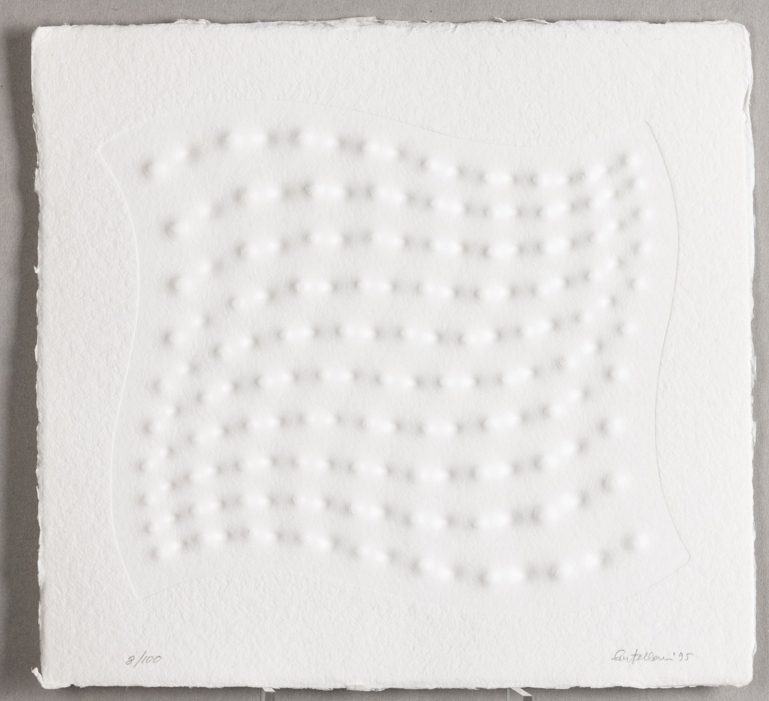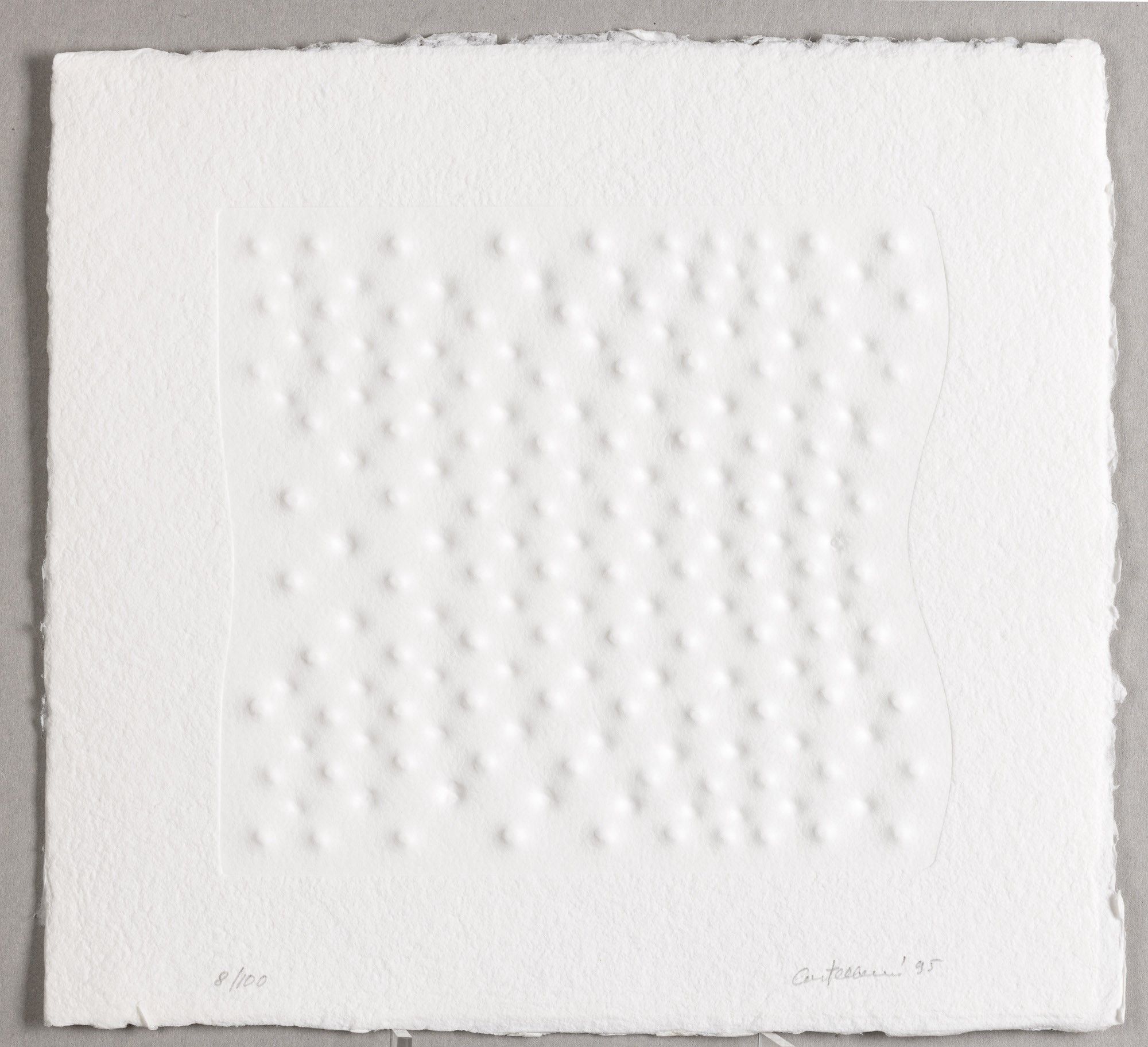 tre rilievi eseguiti con impressione a secco, Largh. 25 - Alt. 22 Cm 1995 ess. 8/100 su una tiratura complessiva di 100 esemplari in numeri arabi e 15 esemplari P.A. in numeri romani ciascun foglio è firmato in basso a destra e numerato in basso a sinistra Entro custodia originale in cartone contenente anche il volume