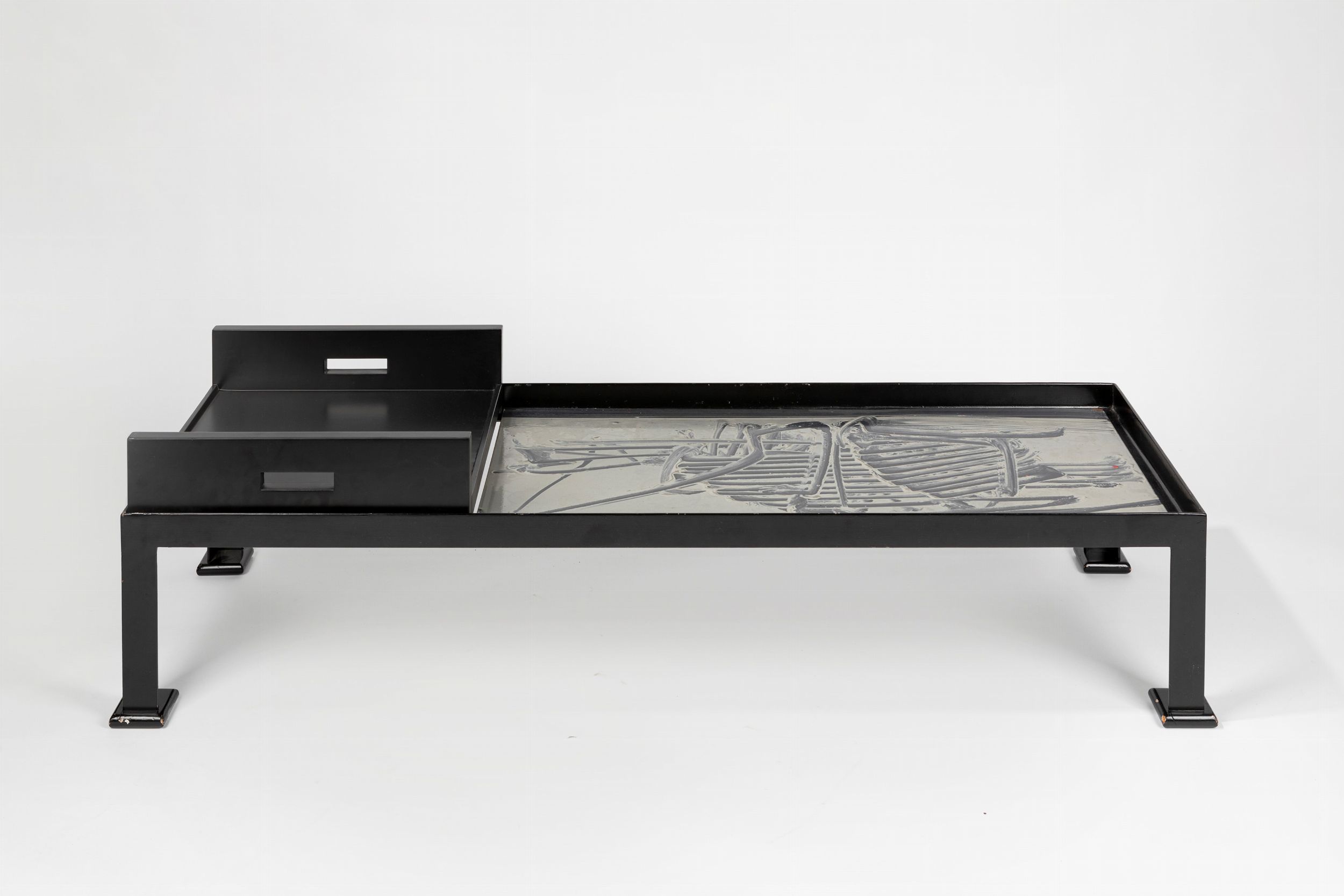 smalto su lamiera di metallo, cm 48,3 x 99 (lastra); cm h 41,3 x 153 x 53 (struttura tavolino+vassoio nero) 1961
