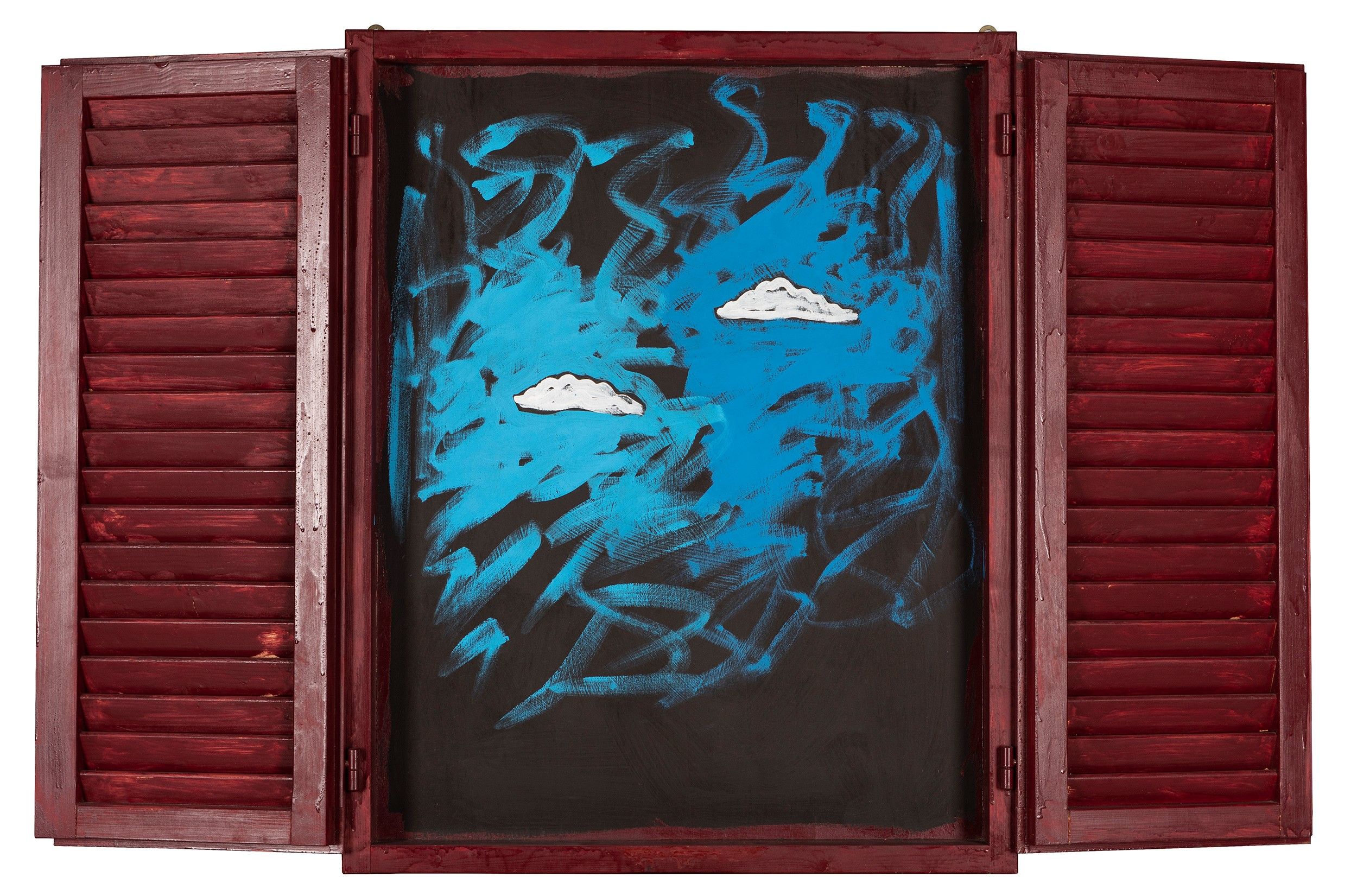 smalto industriale, tempera su battenti di persiana, maniglia, telaio in legno su tavola, cm 100 x 80 (chiusa); cm 100 x 156 (in estensione)