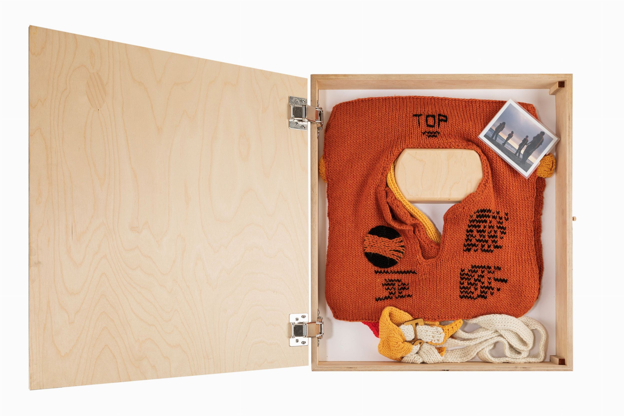 tecnica mista (giubbotto di salvataggio realizzato a maglia, lana, legno, 04 fotografie), es. di 40, 52 x 59 x 8 cm (misure della custodia)