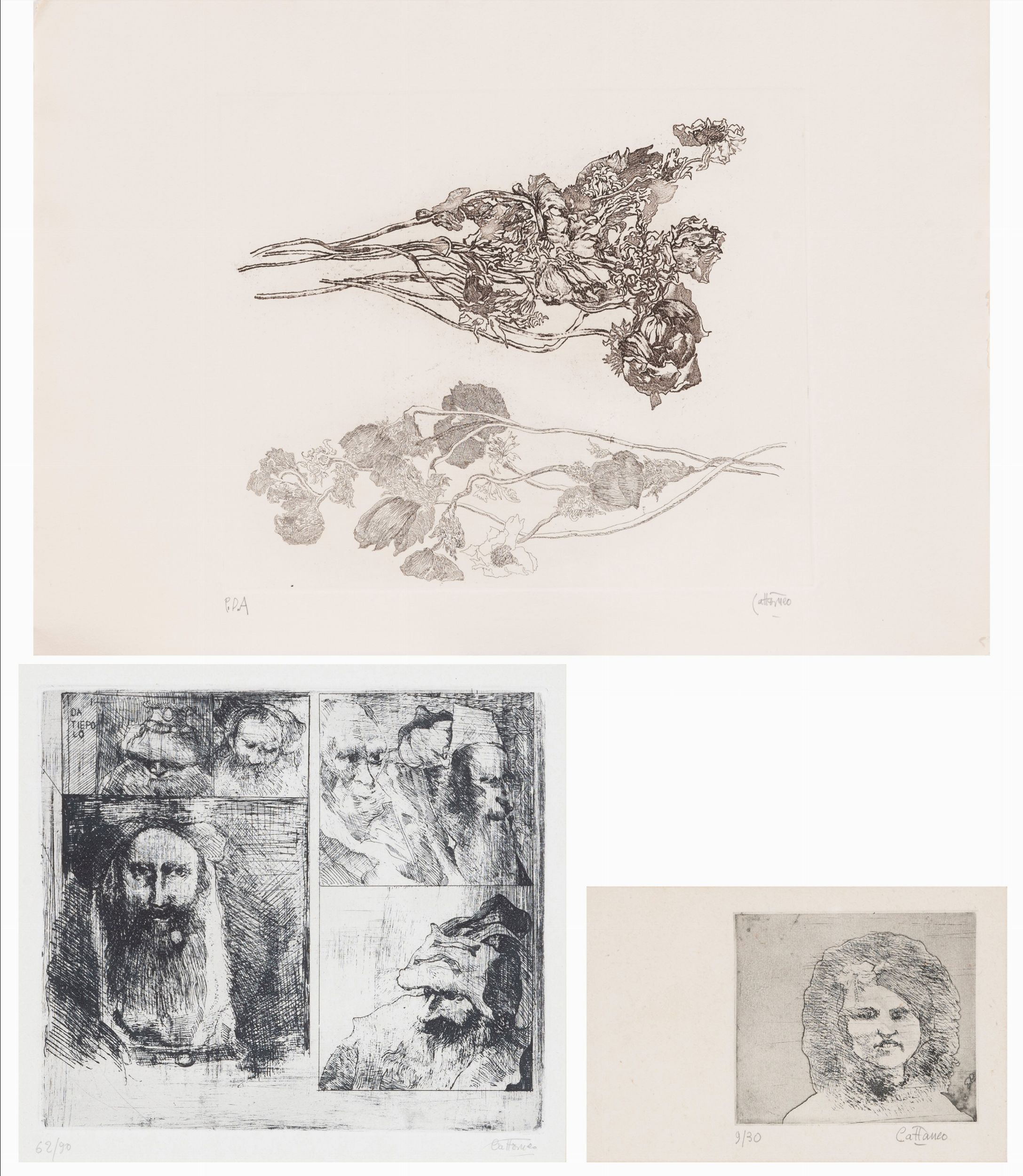 lotto di 3 acqueforti, cm. 25x30 - 21,5x24 - 10x14