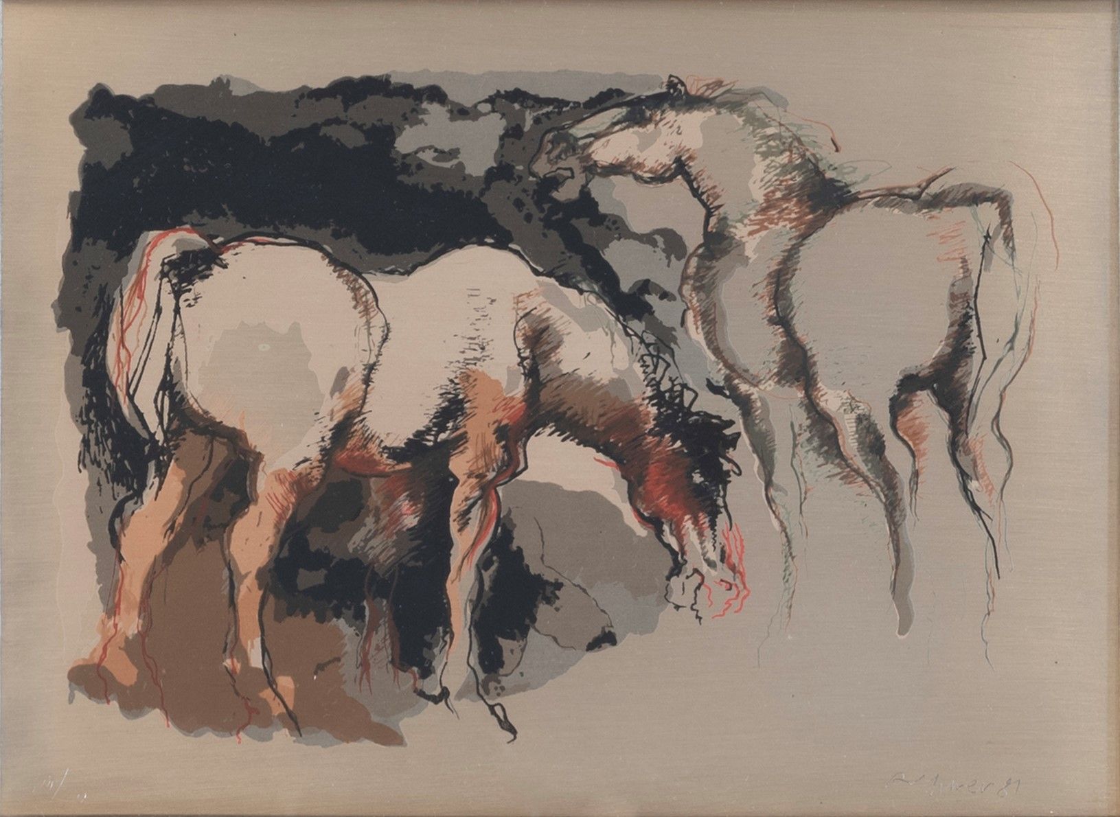 Cavalli in libertà 1981 serigrafia su lastra d'argento es. 19/30 cm. 17x23 firmato datato e numerato