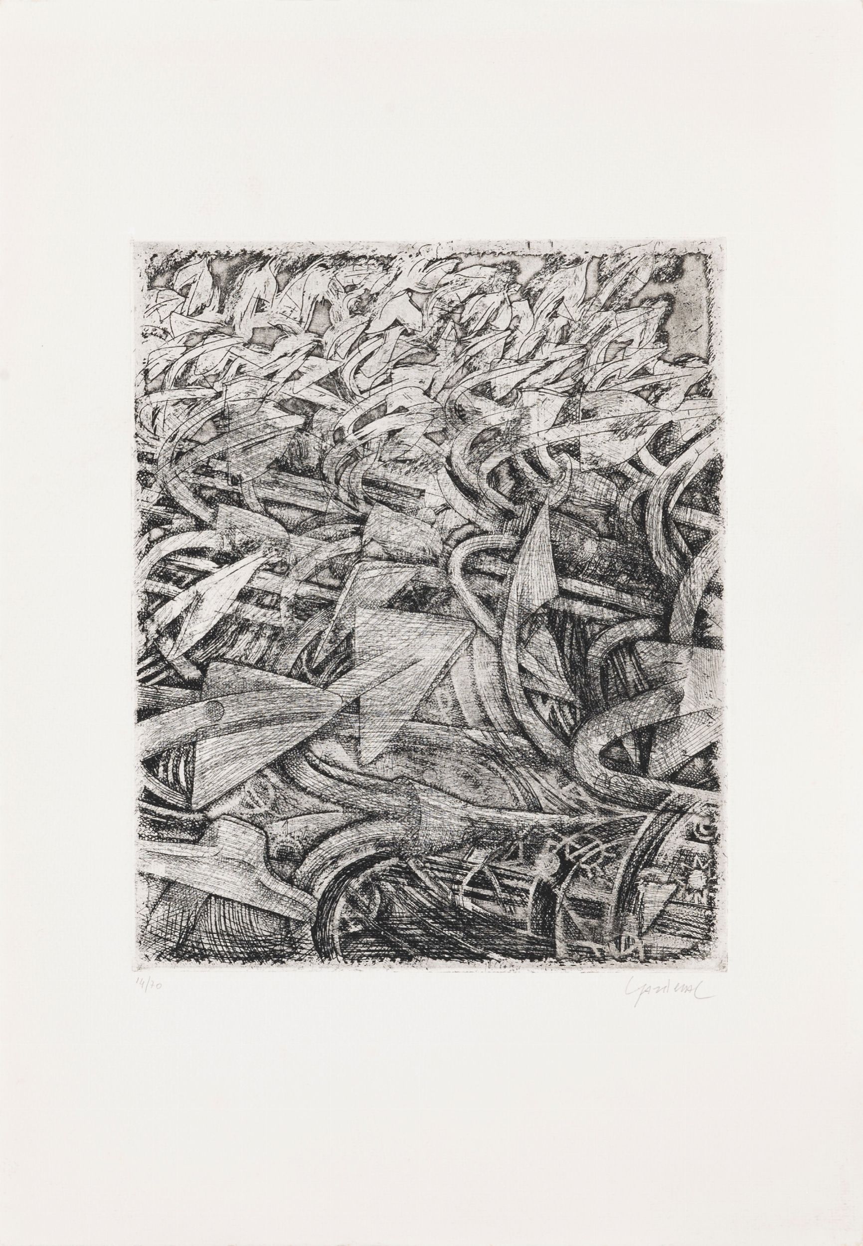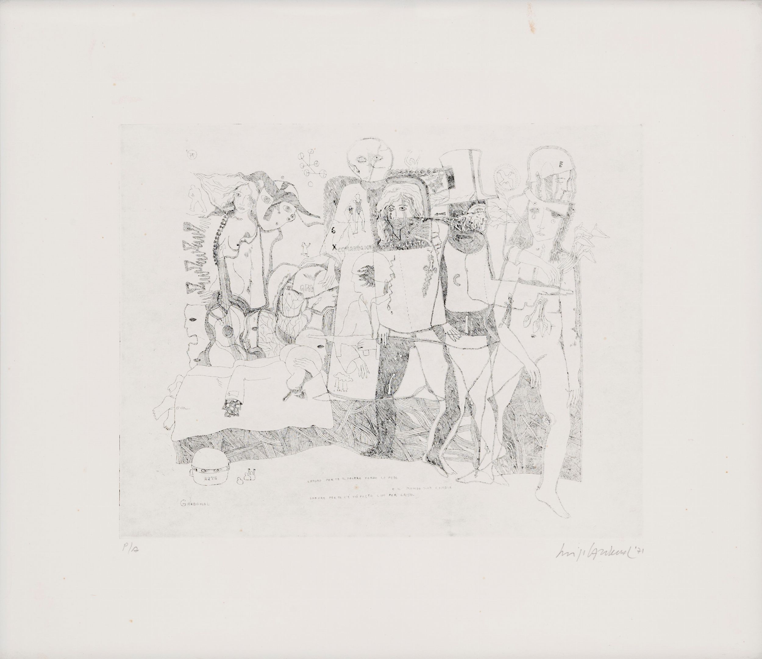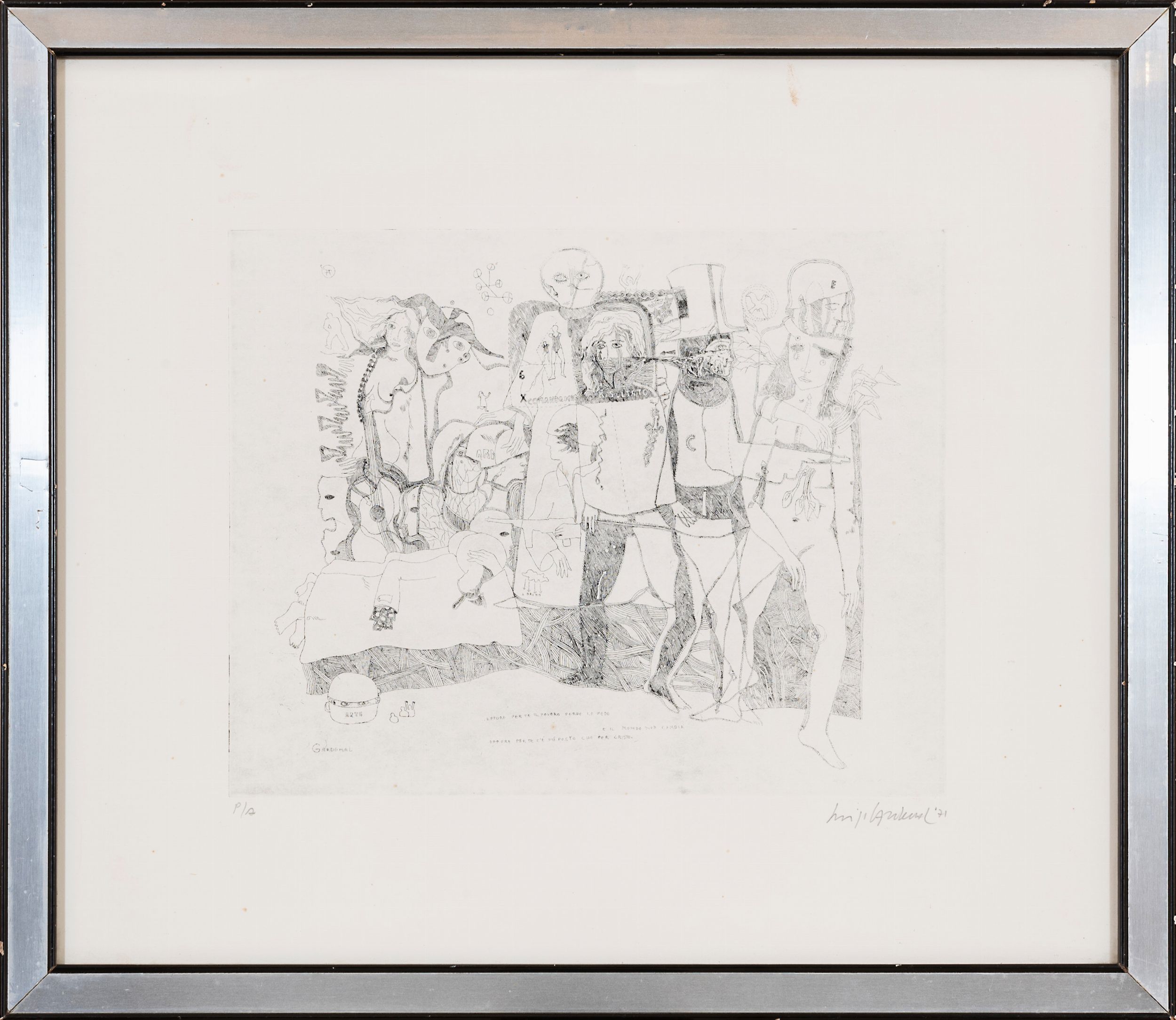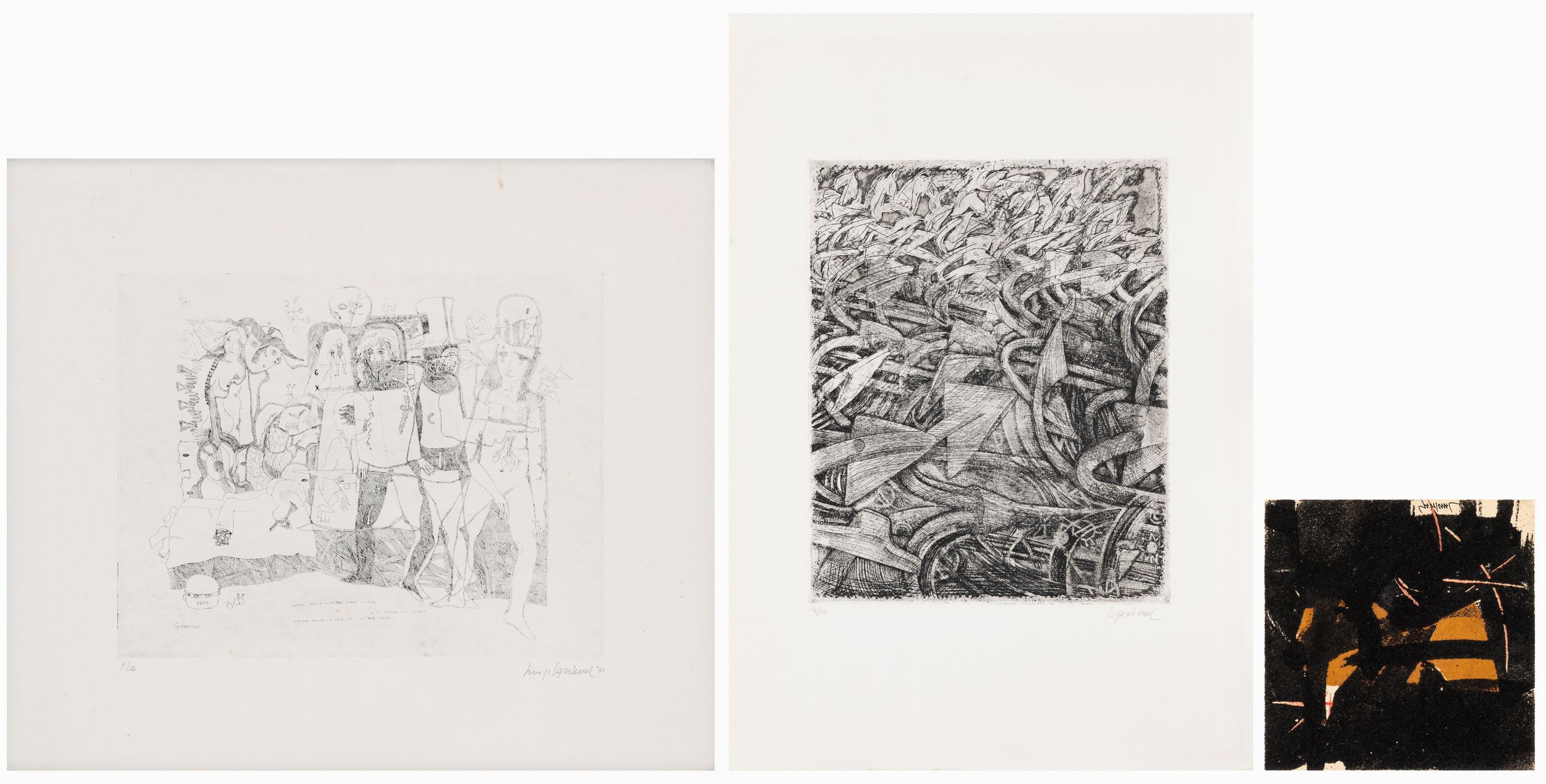lotto di 1 tecnica mista su cartoncino e 2 acqueforti, misure varie